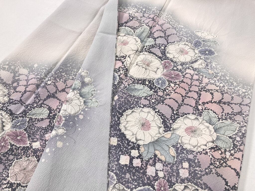 やわらかな「ぼかし染め」で、紫がかった淡い黒へのグラデーションによりメリハリが生まれ、多彩な「友禅」「ぼかし染め」「蝋叩き染め」「墨絵書き」「手絞り」を駆使し、幻想的に彩られた[辻ヶ花]が美しく咲き乱れた、意匠美の作品です。