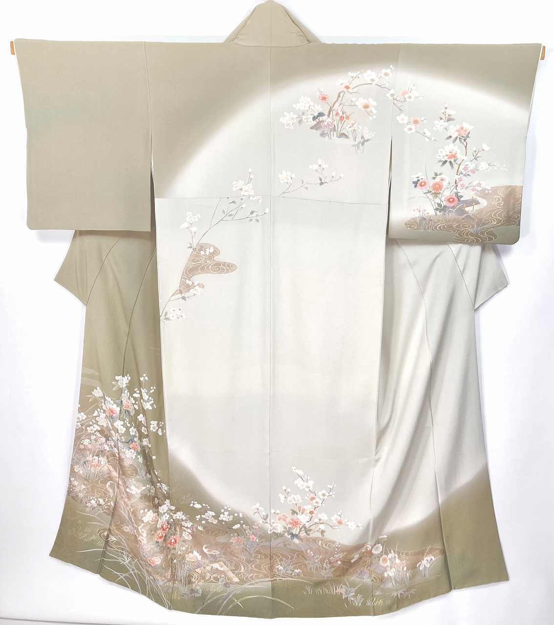 グレーがかった淡く渋い緑色で大胆な「染め分け」を施し、梅・椿・菊・杜若・桔梗などの[四季の花々]が咲き乱れ、気品高く煌めく「金彩」「銀彩」を散りばめた格調高い[観世水]をあしらった[霞取り]を配した、意匠美の作品です。