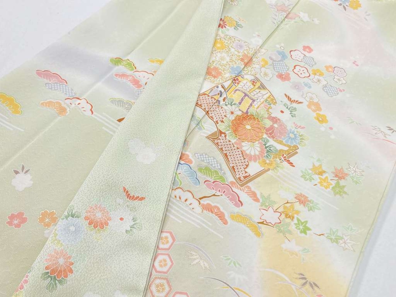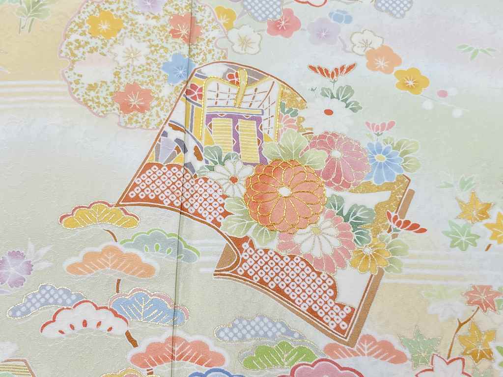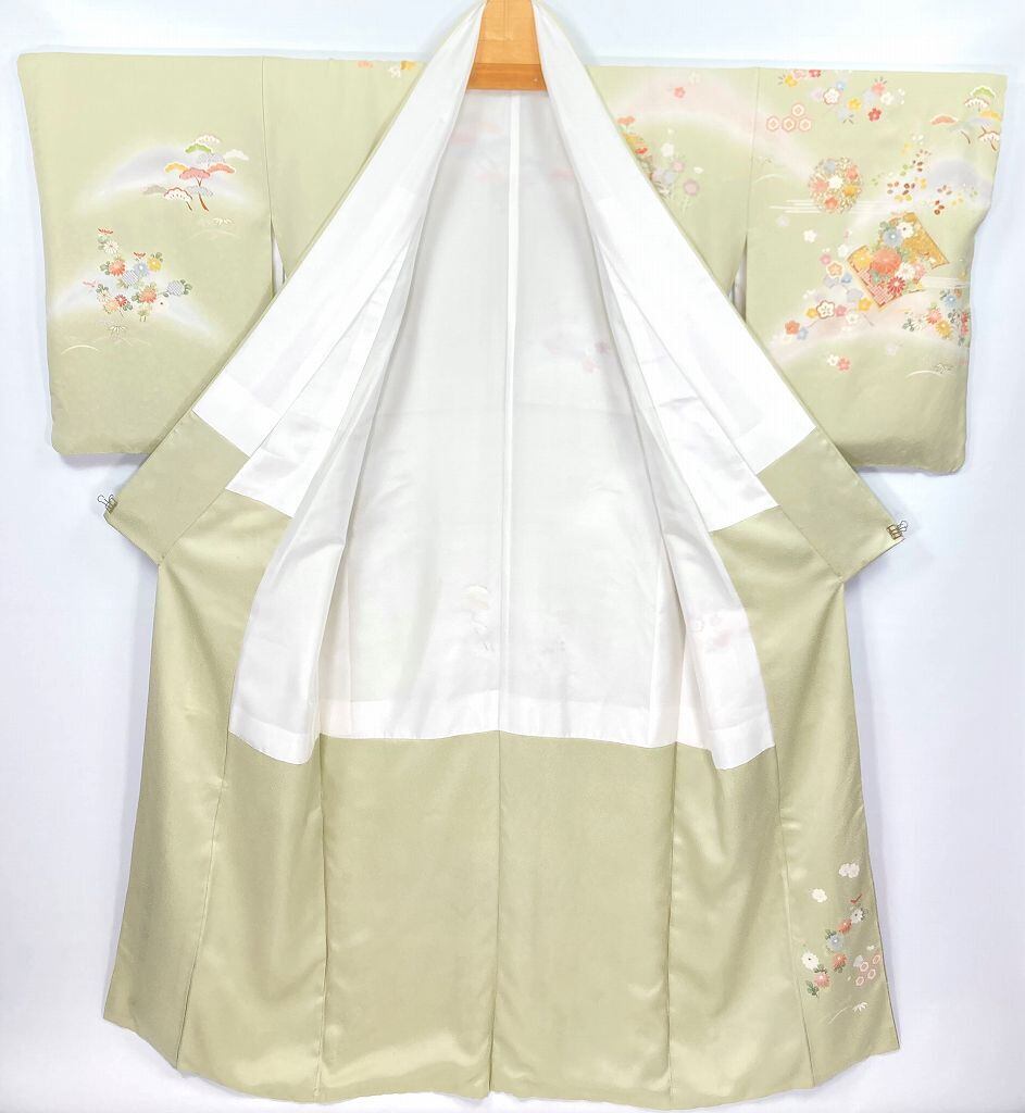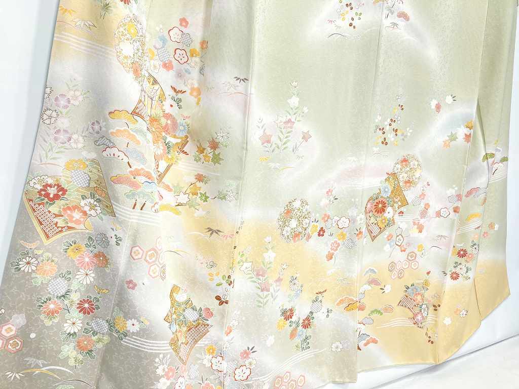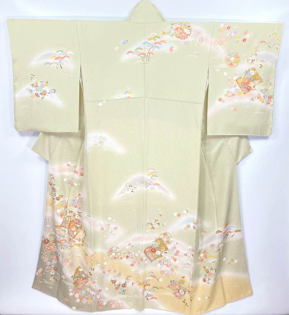 優しいパステルカラーのピンク・水色・紫のやわらかな「ぼかし染め」を散りばめ、淡い黄色とシックなベージュの「染め分け」によりメリハリが生まれ、縁起の良い吉祥文の[松竹梅]や菊・椿・撫子・桜などの[四季の花々]が咲き乱れ、気品高く煌めく「金彩」の縁取りを施し、美しく輝く「本金箔」をふんだんに花々をあしらった雅やかな[冊子文]と[雪輪]を間隔良く配し、上前には丹念な手仕事による「金駒刺繍」を施した、華麗な絵羽柄が美しい豪華で大変見事な作品です。