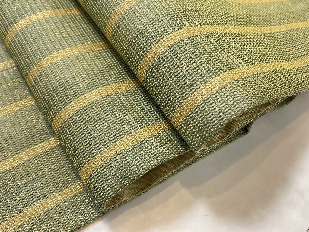 ■金糸を全体にきめ細かく織り込んだ「金通し」が美しく煌めき、淡い黄緑から緑へのグラーデションにゴールドのスタイリッシュな縦縞を配し、お太鼓と前帯には横縞にモダンな[菱文]を丹念に編み上げた、素晴らしい作品です。