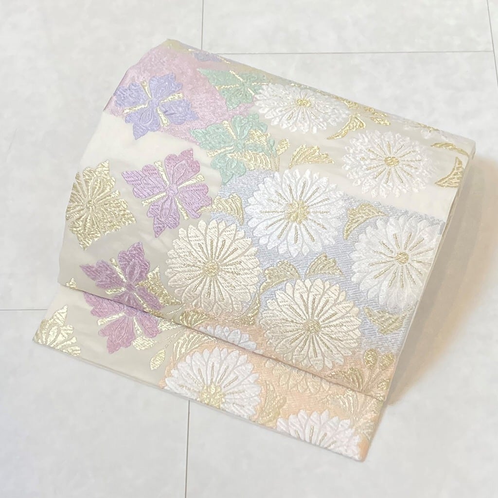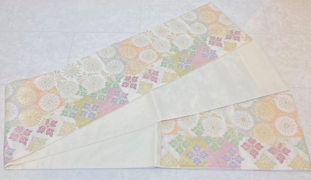 ◇やわらかな白地に、清楚な白やパステルカラーの色合いが映える、洗練された現代の柄行のとても優美な袋帯です。