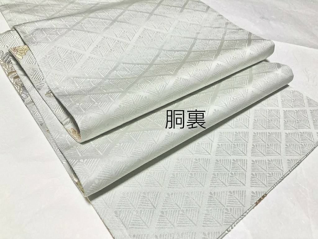 ■グレーみがかった水色の「秘色色」(ひそくいろ) を淡くしたような爽やかな地色に、気品高く煌めく「金糸」と美しい絹糸を使い、刺繍のようにふっくらとした格調高い「唐織り」で、縁起の良い有職文様の[松菱取向鶴文]を間隔良くあしらい、きめ細かな[若松菱]を織り出した、意匠美の素晴らしい作品です。