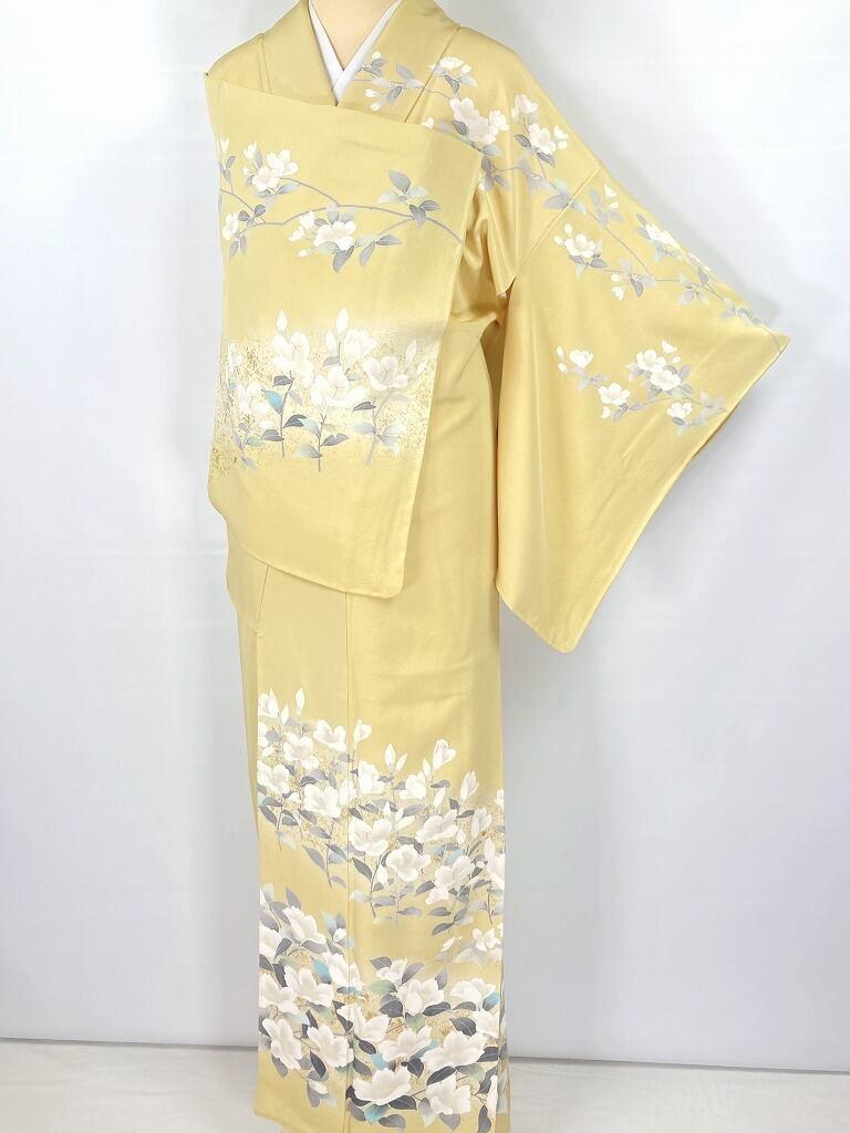 未使用 型染め友禅 本金箔 訪問着 花柄 椿 正絹 黄色 白 淡黄 995