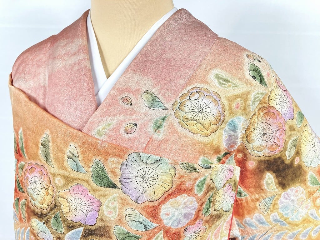 繊細な手仕事による「天目染め」独特の濃淡ある模様に、明るく優しいピンクや黄色のやわらかな「ぼかし染め」を施し、立体感や奥行きが生まれ、深い赤の「染め分け」でメリハリがつき、多彩な「友禅」「ぼかし染め」「墨絵書き」「絞り染め」を駆使し、鮮やかなピンク・紫・水色・黄色・黄緑などに彩られた幻想的な[辻ヶ花]が咲き乱れ、「手絞り」をふんだんに施した華麗な絵羽柄の、手間隙かけて制作されたうっとりするほど美しい大変豪華な作品です。