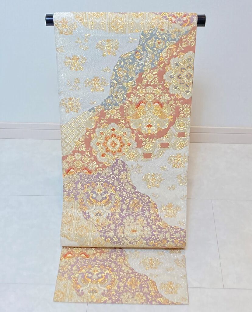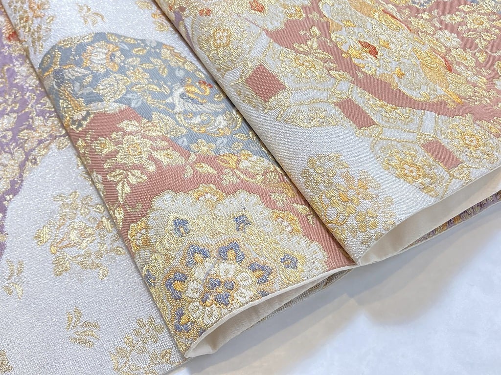■白地に銀糸をきめ細かく織り込んだ「銀通し」がキラキラと輝き、美しく煌めく金糸をふんだんに使い優雅な[華紋][唐花][七宝花菱]、神聖な[鳳凰]縁起の良い[向かい鳳凰]をスタイリッシュな「雲取り」で配した、刺繍のようなふっくらとした「唐織り」で緻密に織り出した、大変加工の良いお品です。