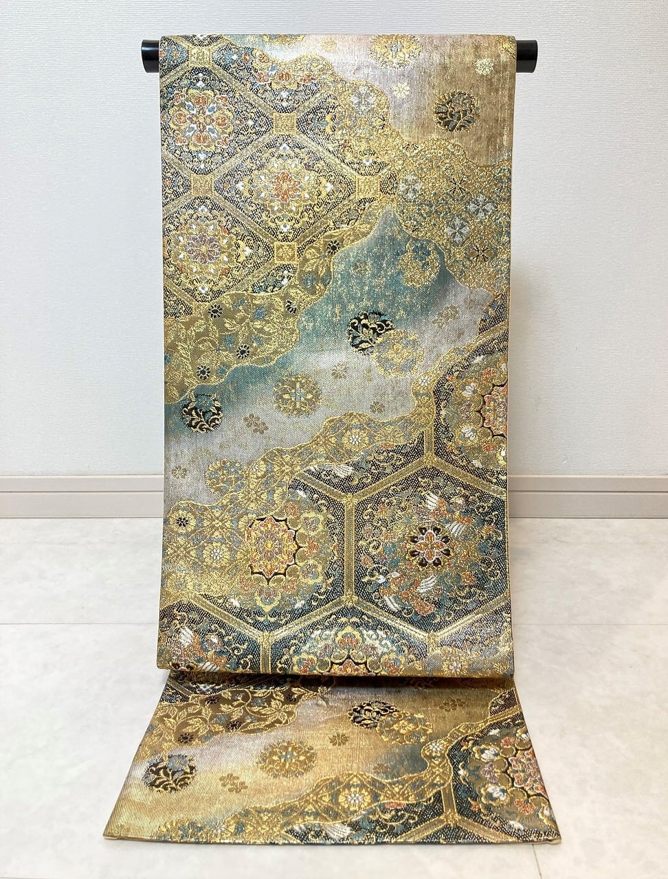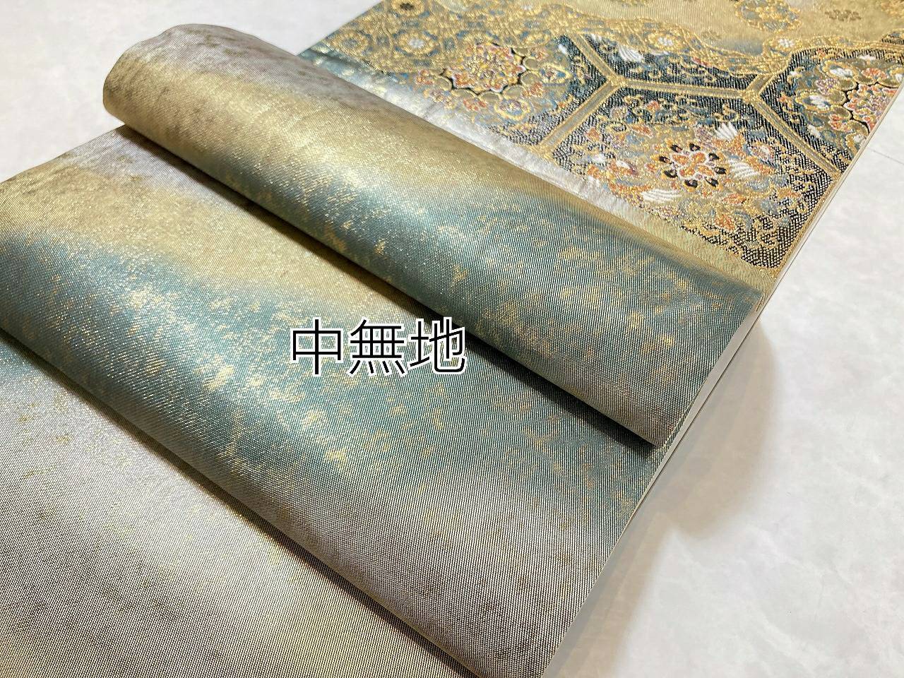 ■深い緑からゴールド、シルバーへのグラーデーションに、上品に煌めく「金箔」を散りばめた豪華な「引き箔」地に、気品高く輝く「金糸」をふんだんに使い、刺繍のような繊細な「唐織り」で、格調高い[蜀江文][亀甲文]にオリエンタルな[宝相華]をあしらい、優雅な[雲取り]に[唐花]や[丸紋]を配しております。