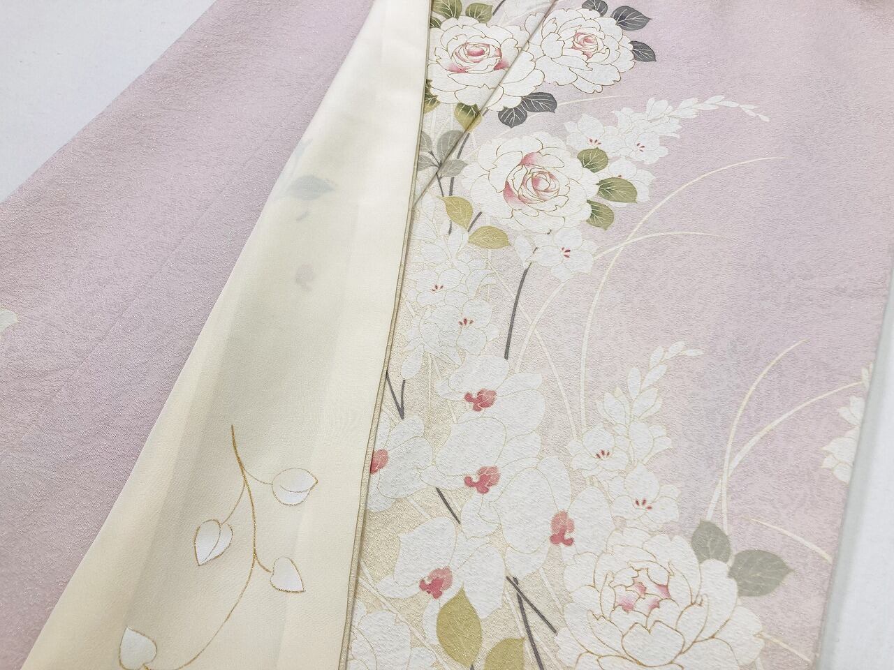 ◇女性らしさを引き立たせるはんなりとした優しい色使いに、清楚な白の[薔薇]や[胡蝶蘭]が映える、とても嫋やかな訪問着です。
