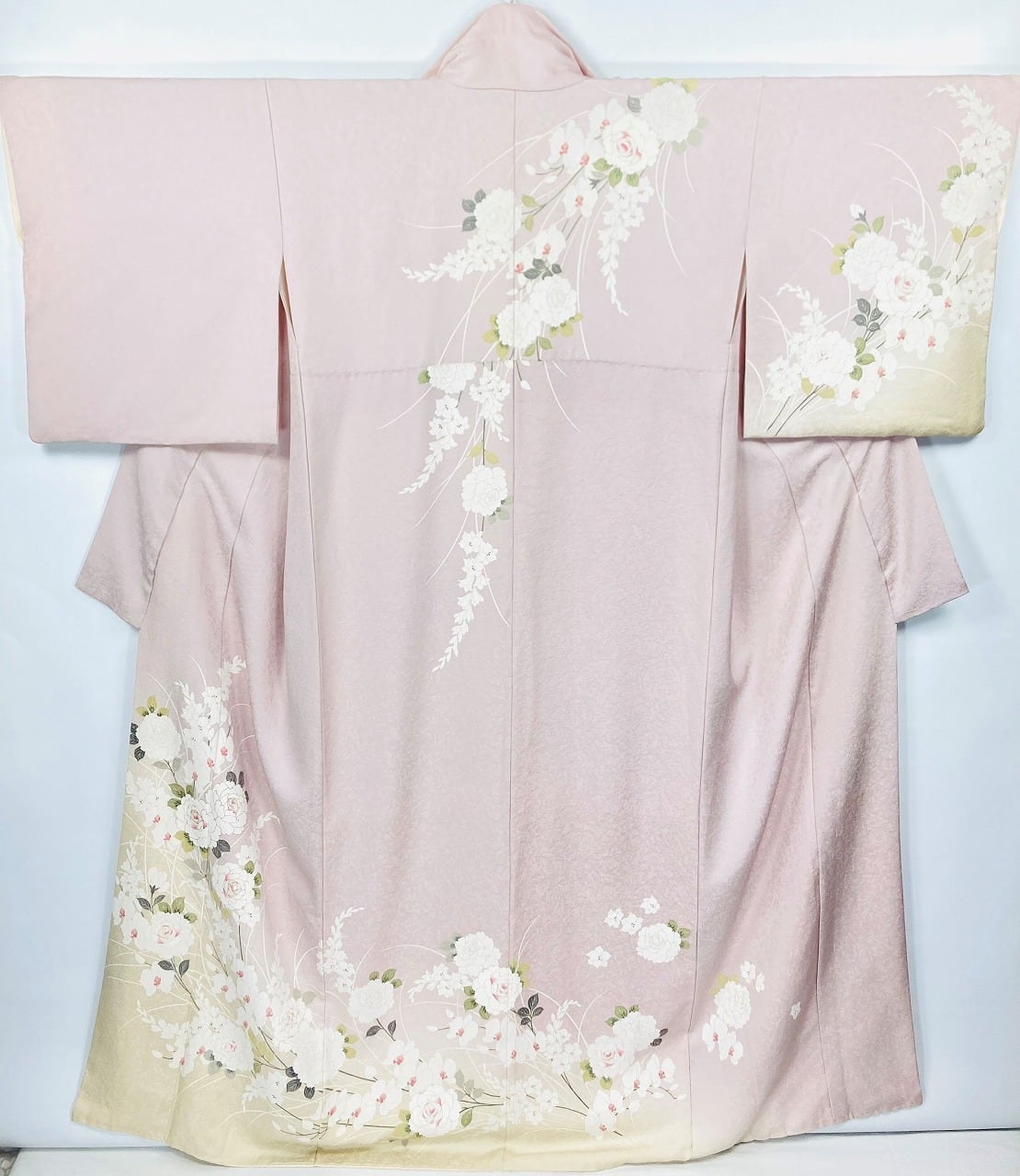全体に銀糸をきめ細かく織り込んだ「銀通し」が角度により美しく煌めいて華やぎを添え、淡くやわらかな黄色の「染め分け」を施し、繊細な「型染め友禅」で気品溢れる[薔薇]と[胡蝶蘭]が優雅に咲き誇り、上品に煌めく「金彩」の縁取りを散りばめた、うっとりするほど美麗な絵羽柄です。