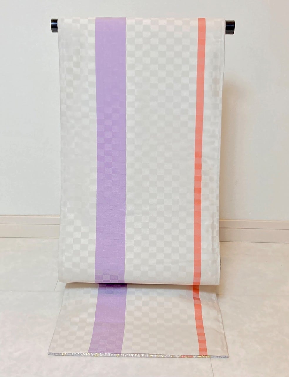 ◎胴裏は、モダンな[市松]の地紋を織り出し、オレンジと紫のスタイリッシュなストライプを「全通」施した、豪華な【リバーシブル】の仕上げになっております。