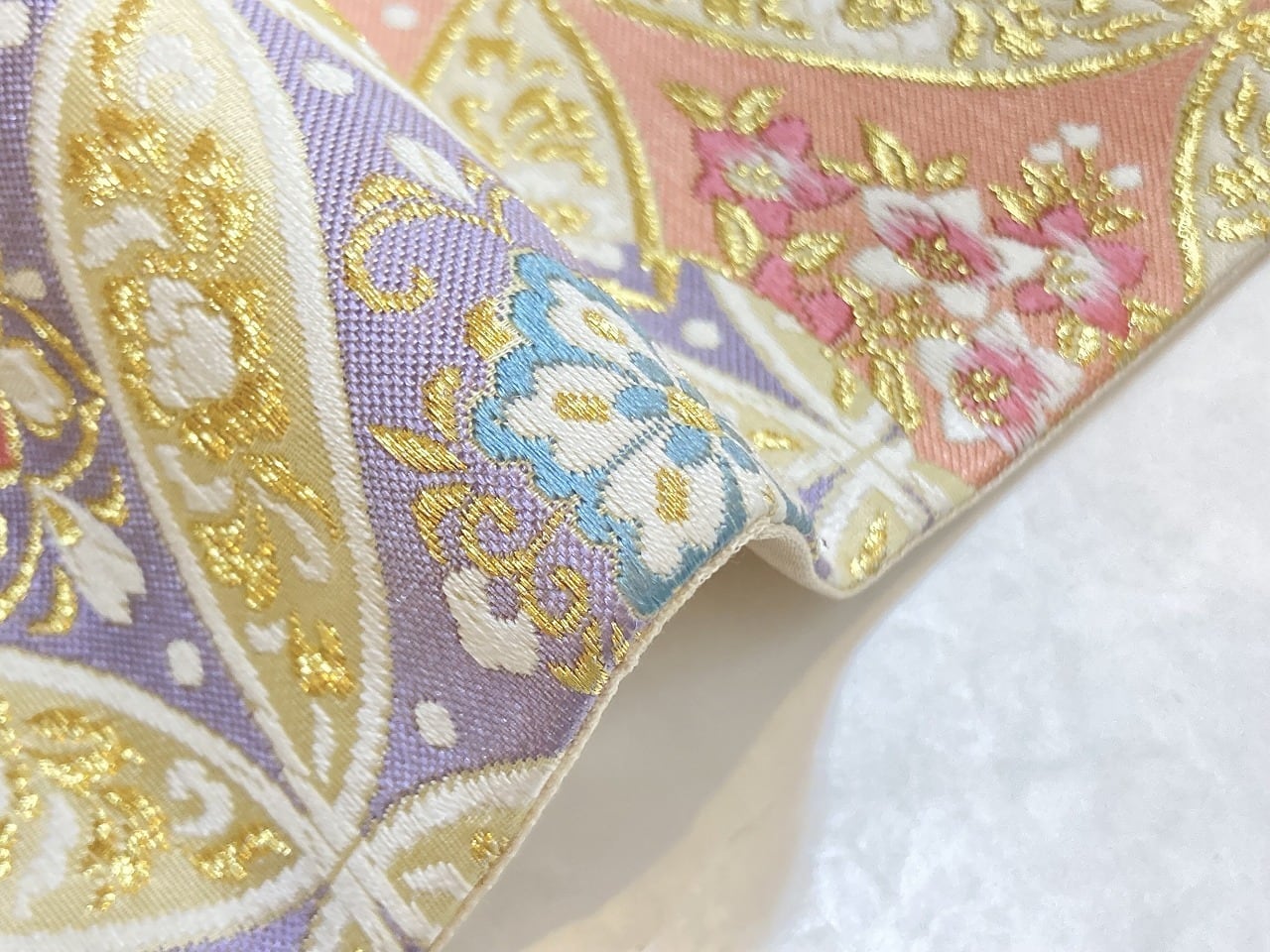 皇帝貝紫 西陣織 やまひで 唐織 正絹 袋帯 華紋 七宝 パステル クリーム 紫 522