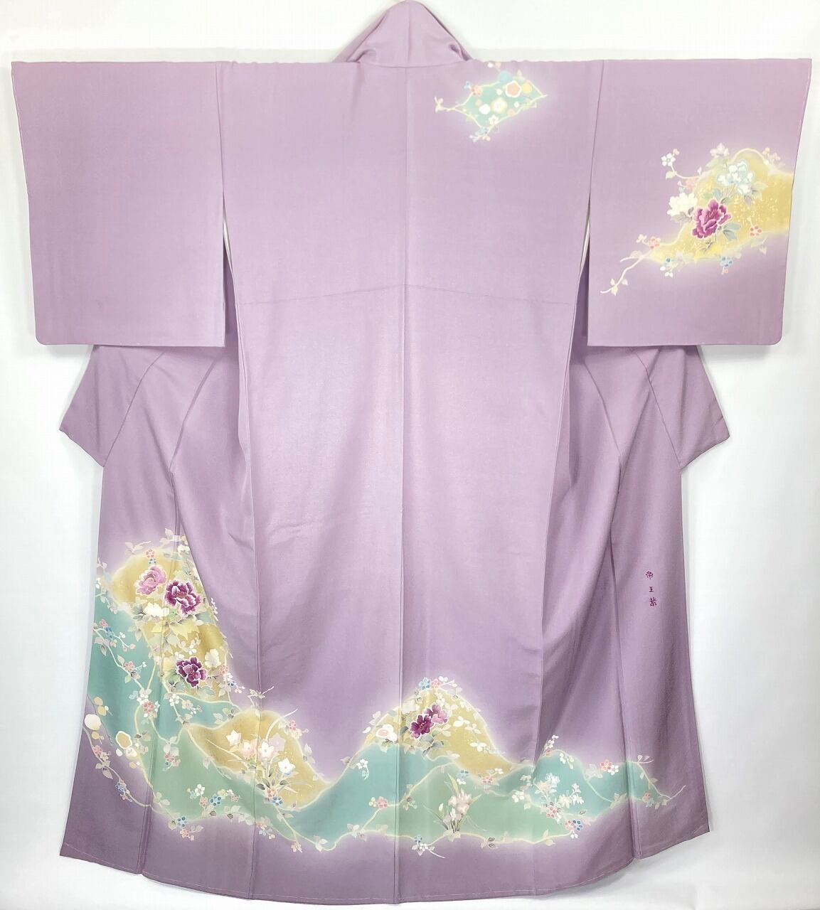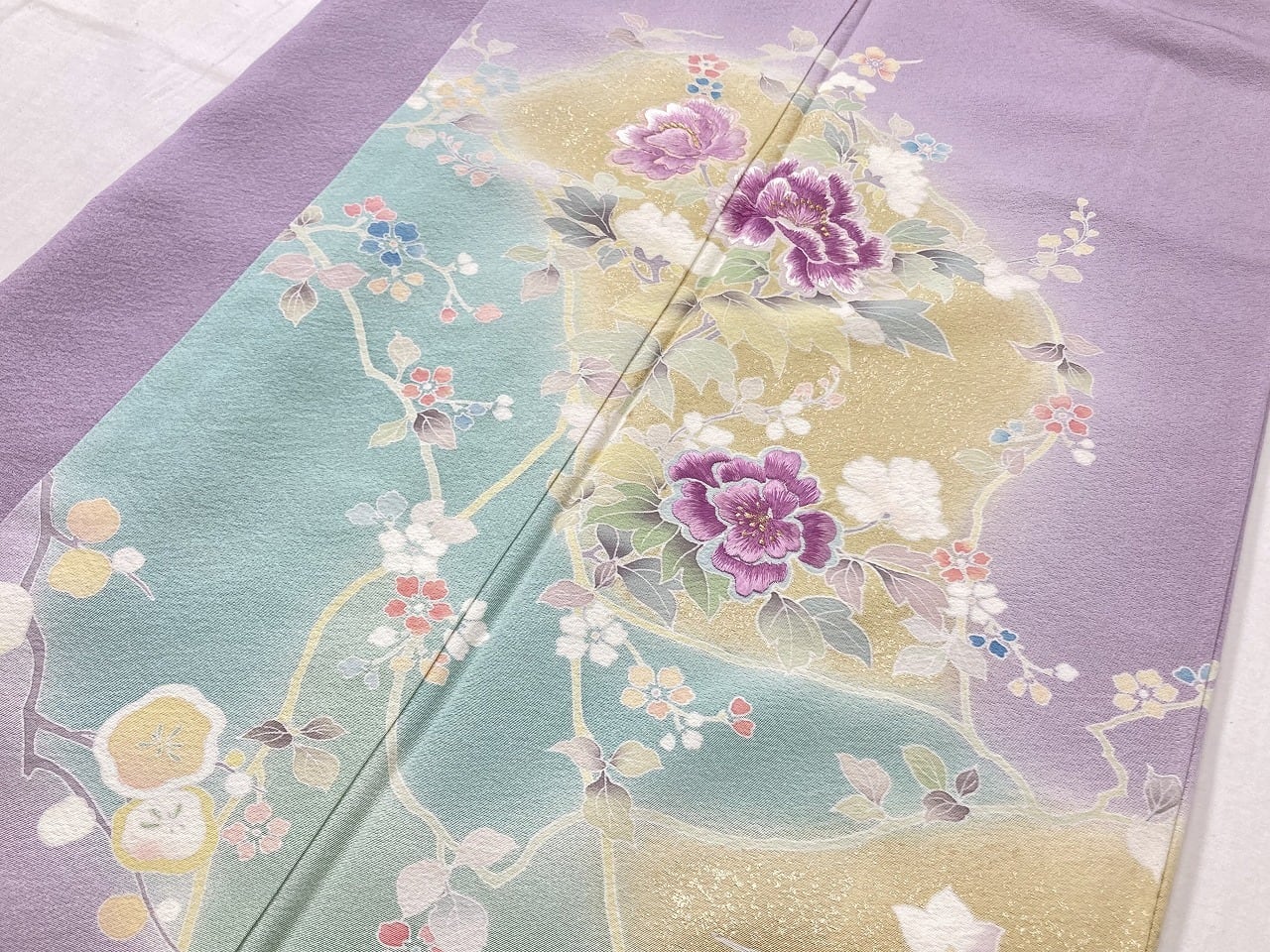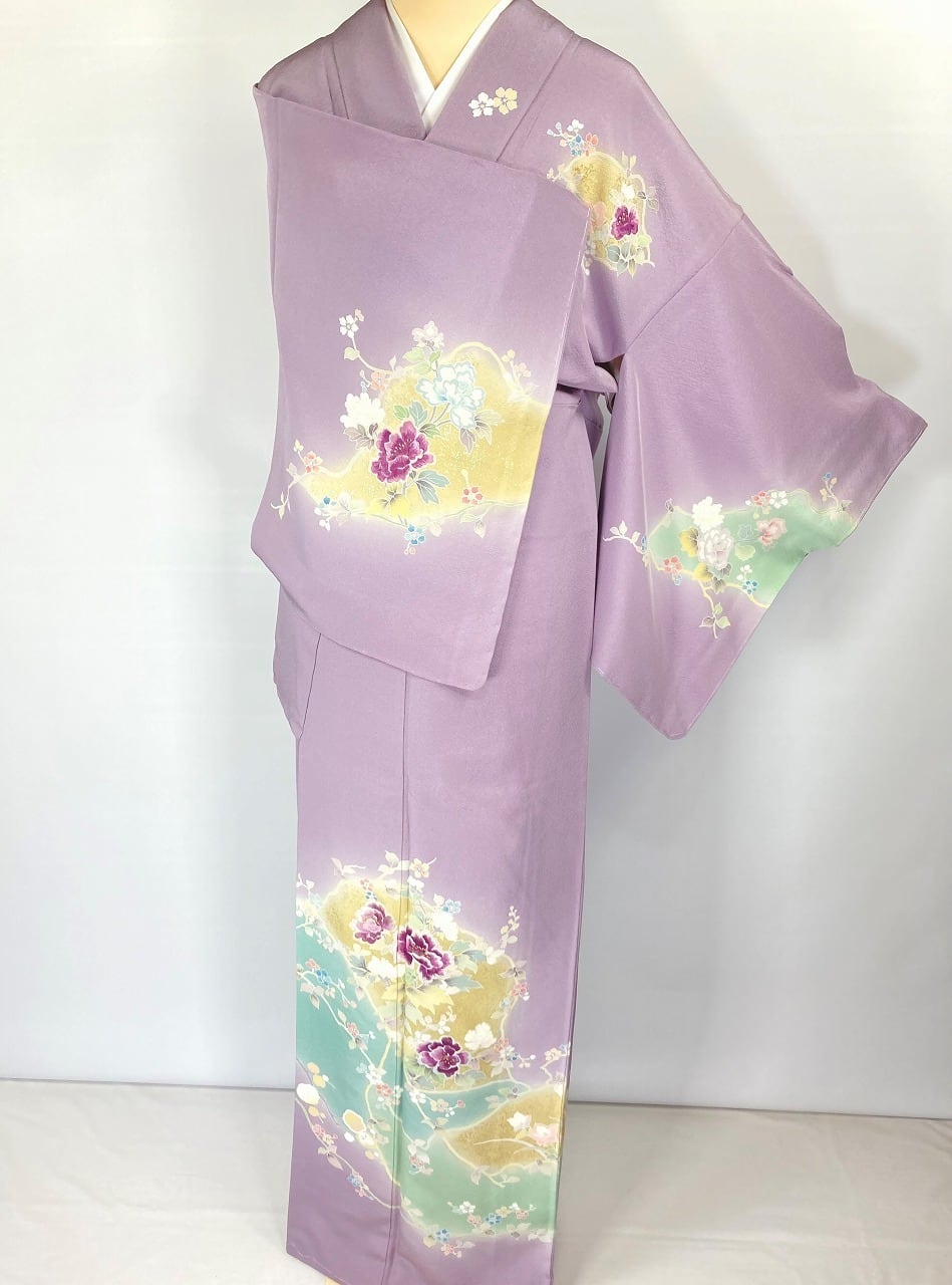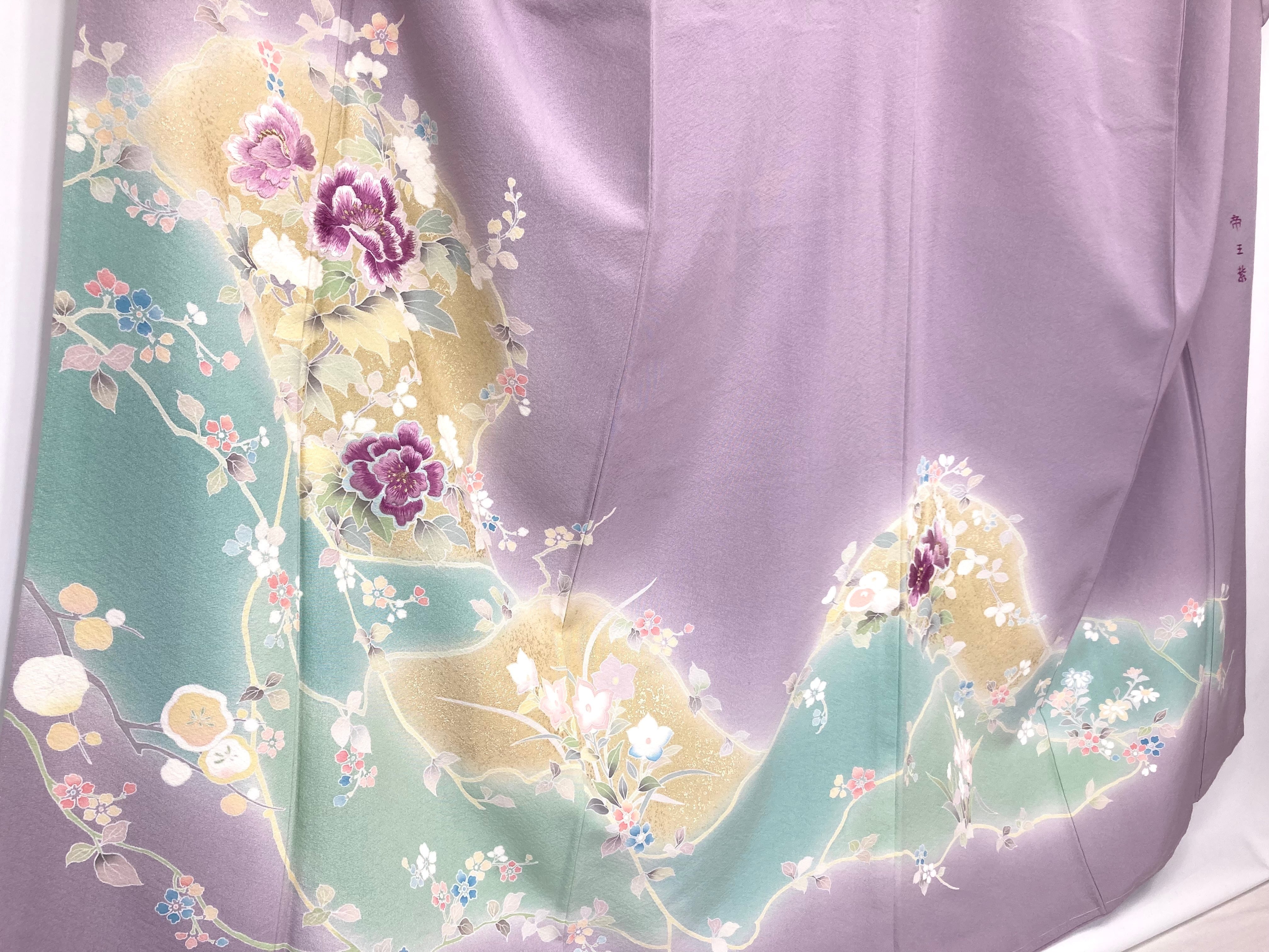 やわらかな「ぼかし染め」で優しい黄緑・黄色やティファニーブルーの「染め分け」が美しく、繊細な「型染め友禅」で牡丹・梅・桔梗・杜若・椿などの[四季の花々]を優雅に配し、上品に煌めく「本金箔」を散りばめ、上前・左胸・右後ろ身頃・右後ろ袖には、神秘の素材と言われる貴重な『貝紫』で美しく染め上げられた絹糸を使い緻密な「手刺繍」を施した、うっとりするほど美しい豪華な作品です。