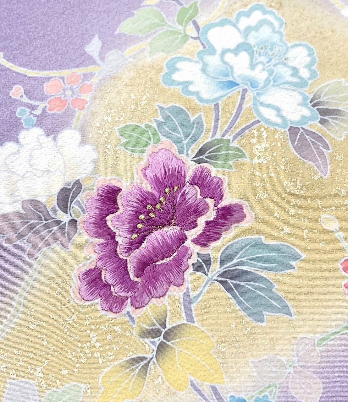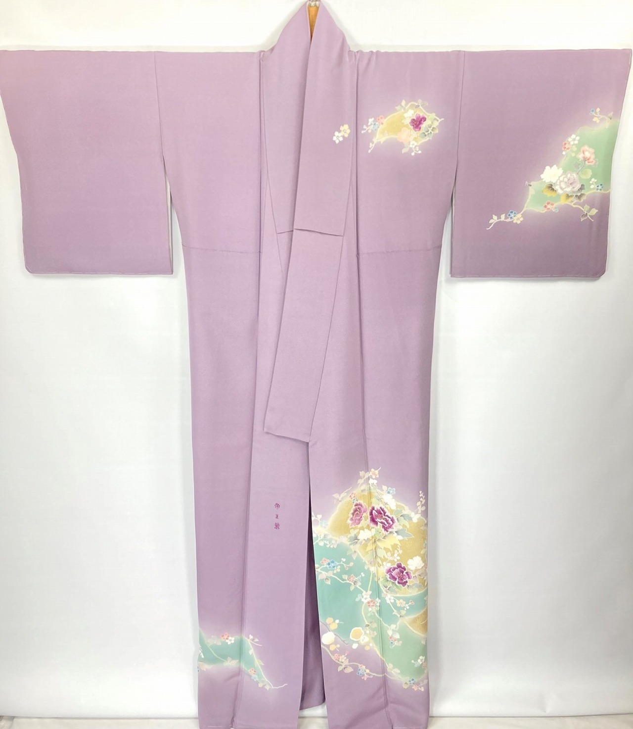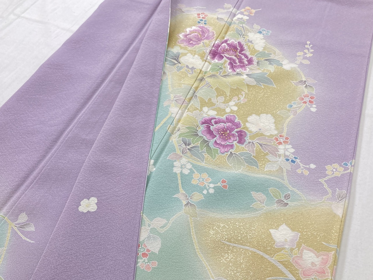 やわらかな「ぼかし染め」で優しい黄緑・黄色やティファニーブルーの「染め分け」が美しく、繊細な「型染め友禅」で牡丹・梅・桔梗・杜若・椿などの[四季の花々]を優雅に配し、上品に煌めく「本金箔」を散りばめ、上前・左胸・右後ろ身頃・右後ろ袖には、神秘の素材と言われる貴重な『貝紫』で美しく染め上げられた絹糸を使い緻密な「手刺繍」を施した、うっとりするほど美しい豪華な作品です。
