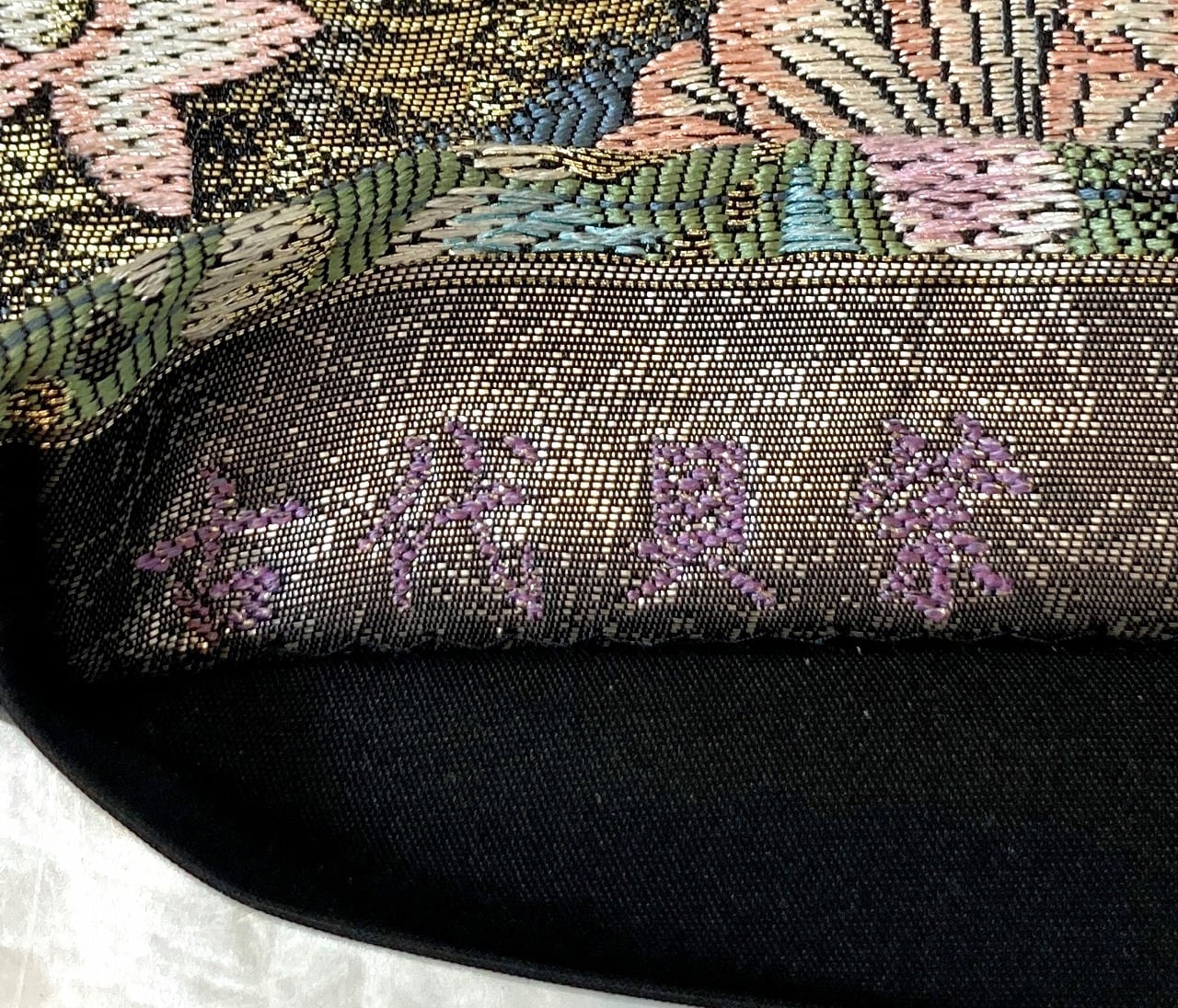 ■黒地に紫・緑・青、美しく煌めく「金糸」「銀糸」を交互にあしらった[松皮菱取り]でスタイリッシュに配し、鮮やかに彩られた幻想的な[辻ヶ花]が咲き乱れ、神秘の素材と言われる貴重な「貝紫」を散りばめ、ふっくらとした刺繍のような格調高い「唐織り」で緻密に織り上げた、大変加工の良いお品です。
