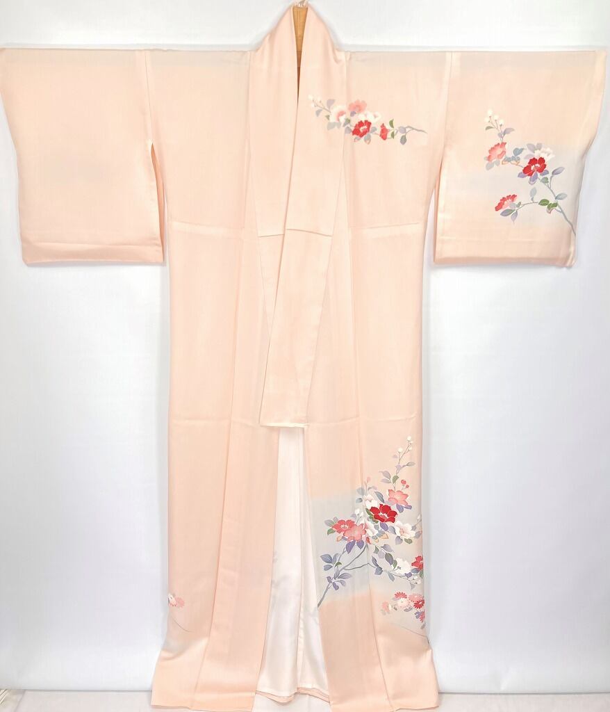 【単衣】手描き友禅 訪問着 四季の花々 正絹 乙女色 ピンク 水色 赤 1056