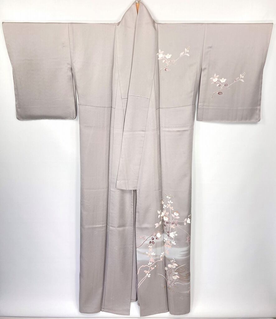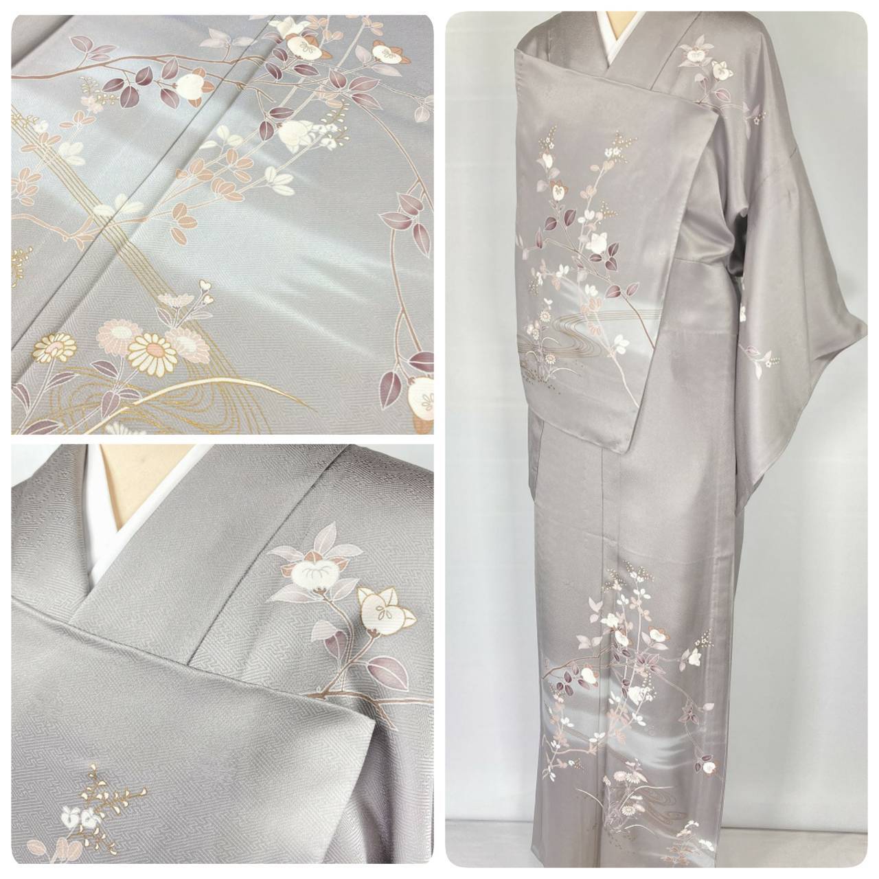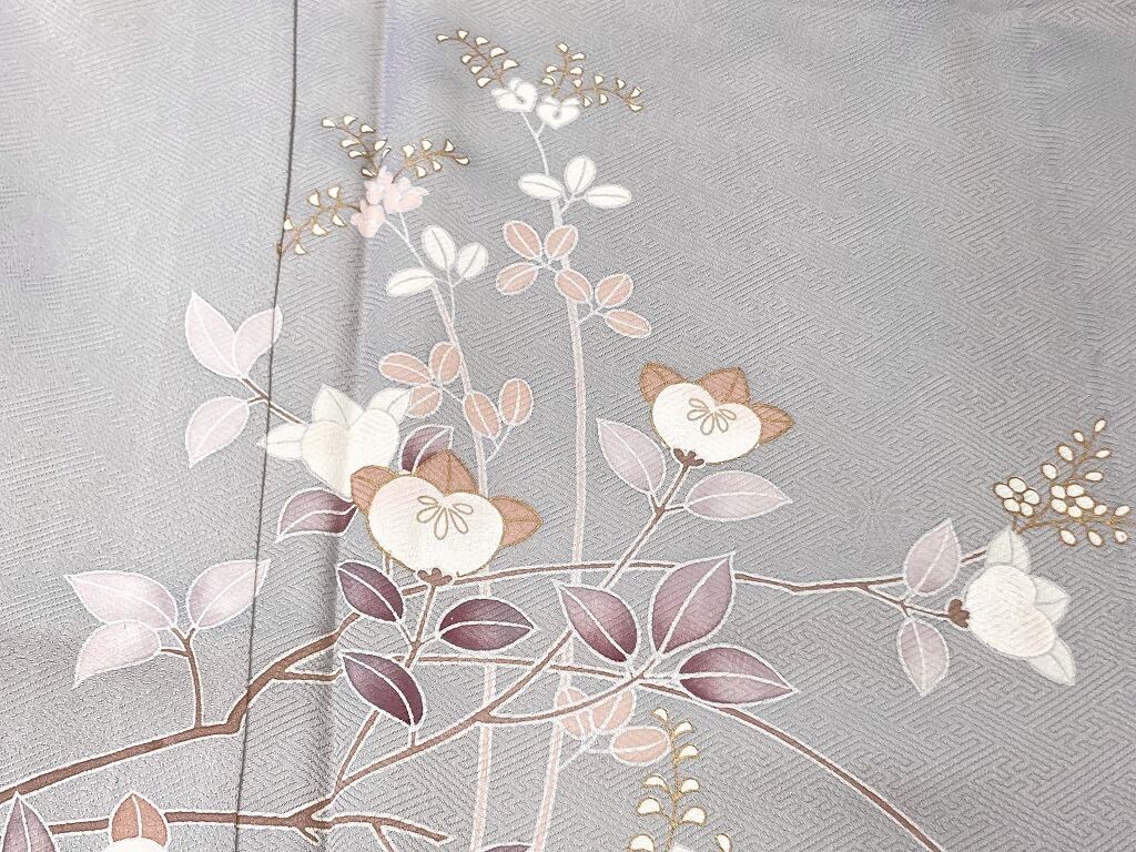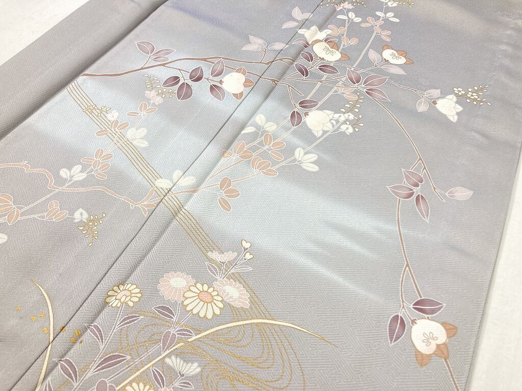 未使用【単衣】型染め友禅 訪問着 一つ紋 花柄 秋草 金彩 正絹 グレー 紫 白 1059