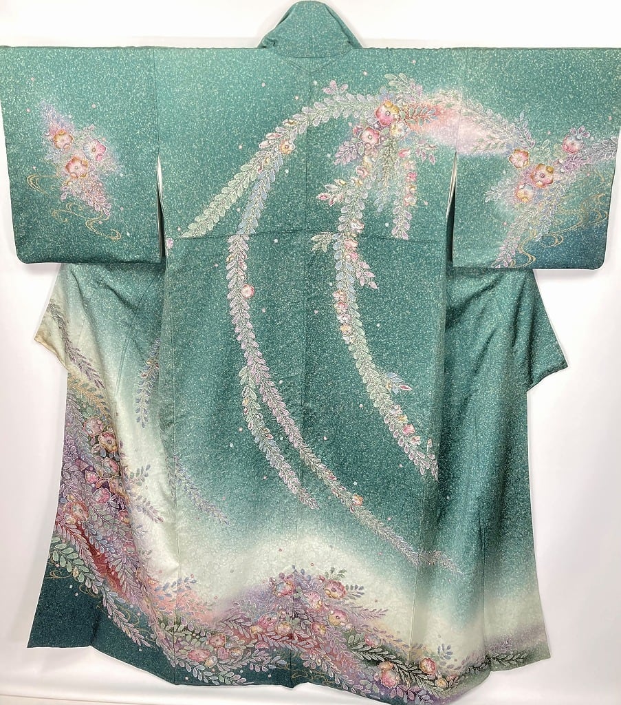 繊細な手仕事による「天目染め」の模様で奥行きや立体感が生まれ、のやわらかな「ぼかし染め」により淡く優しい黄緑から深い緑への美しいグラデーションによりメリハリが生まれ、多彩な「友禅」「金彩」「手絞り」を駆使し、色鮮やかな「辻ヶ花 」が咲き乱れて上部からは優雅に枝垂れ、ひとつひとつ繊細な手絞りをふんだんに施した、意匠を凝らした大変素晴らしい作品です。