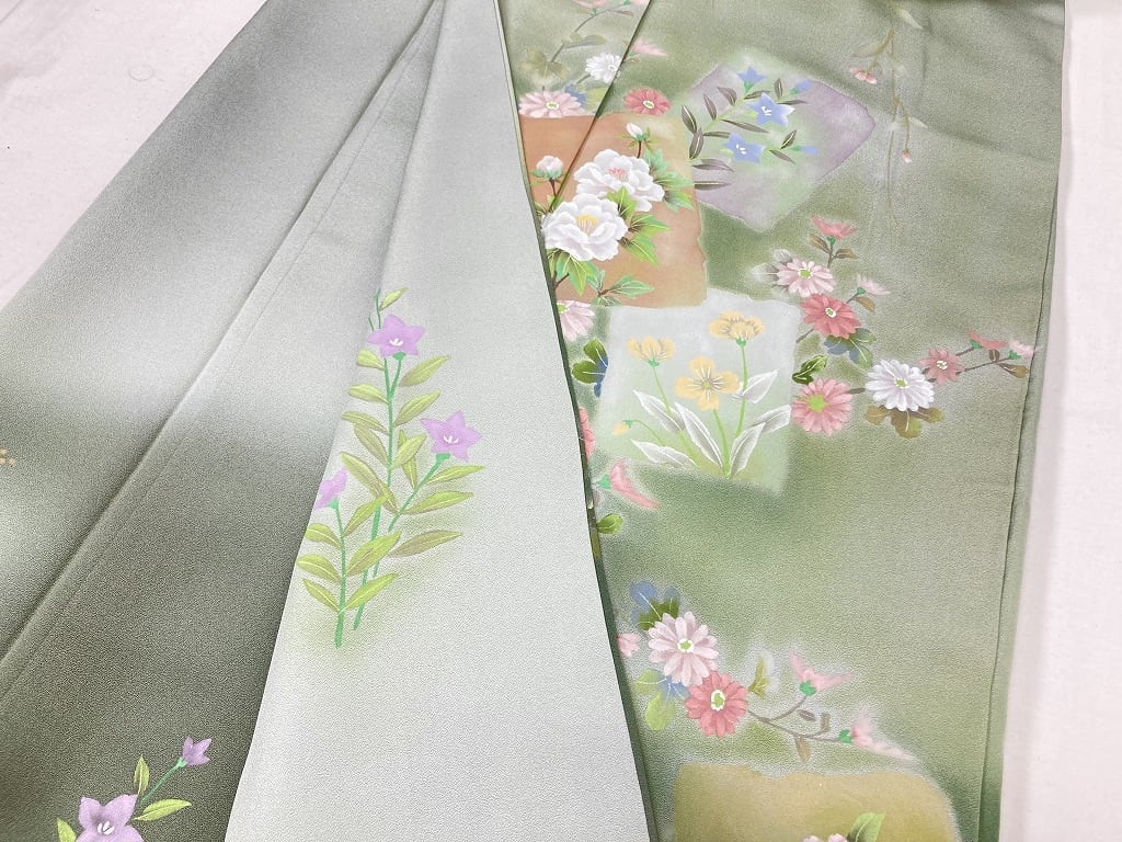 やわらかな「ぼかし染め」で深い緑へのグラデーションによりメリハリが生まれ、明るく優しいクリーム色地に、一筆一筆息遣いの聞こえる絵画のような「無線友禅」で、牡丹・菊・椿・桔梗・梅・桜・藤などの[四季の花々]が美しく散りばめられ、和歌や俳句などを描く古典柄の[色紙]にも花々があしらわれ間隔良く配しております。