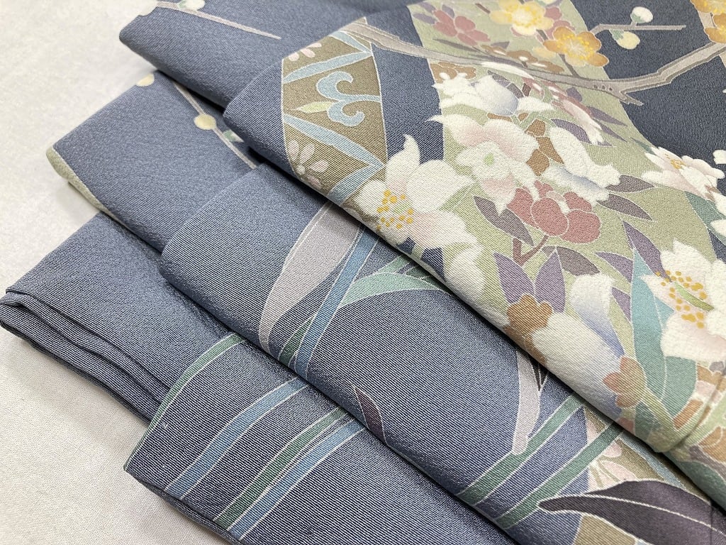十日町友禅 作家物 手描き友禅 訪問着 花柄 正絹 ブルー グレー 白 1095