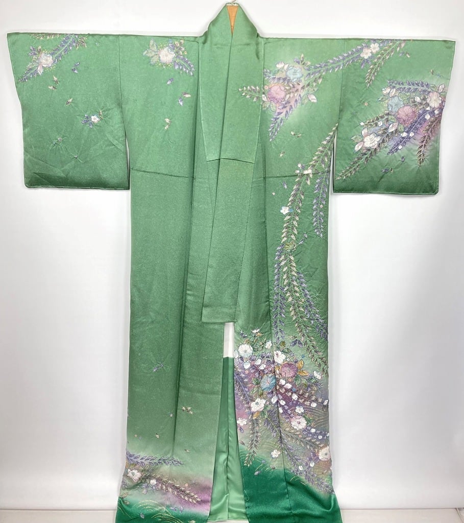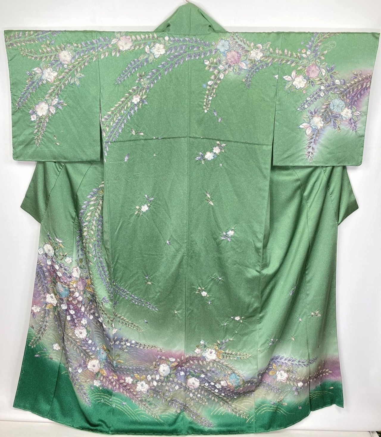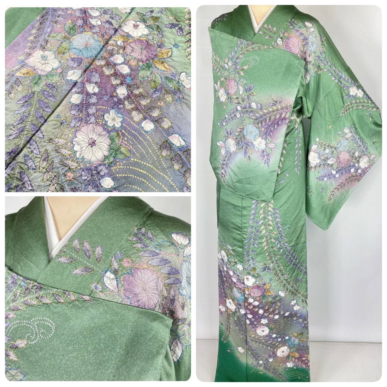繊細な手仕事による「天目染め」を全体に施し、きめ細かな模様で奥行きが生まれ、のやわらかな「ぼかし染め」により淡い緑から鮮やかで濃い緑への美しいグラデーションによりメリハリが生まれ、多彩な「友禅」「金彩」「手絞り」を駆使し、幻想的に彩られた「辻ヶ花 」が咲き乱れて、ひとつひとつ繊細な手絞りをふんだんに施した、意匠を凝らした大変素晴らしい作品です。