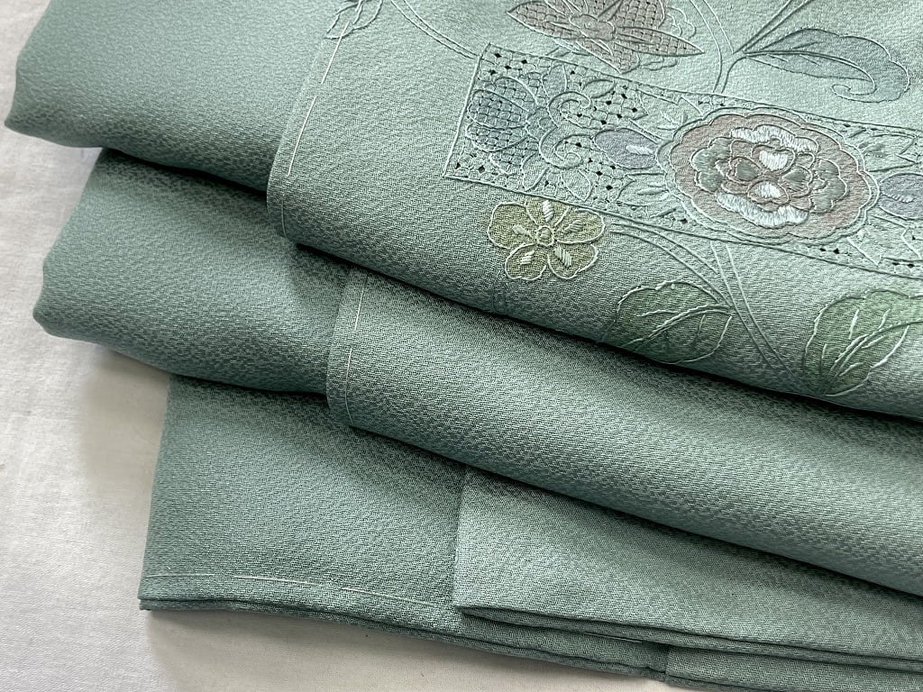 未使用 汕頭 蘇州 相良 中国三大刺繍 総刺繍 唐花 訪問着 正絹 青緑 1107