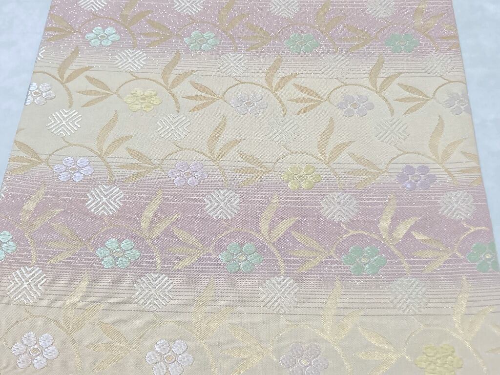 ■淡いクリーム色地に優しい赤紫のグラーデーションを配し、きめ細かく織り込んだ「銀糸」がキラキラと輝き、シャンパンゴールドのように気品高く煌めく「金糸」と、刺繍のようにふっくらとした格調高い「唐織り」を駆使し、清楚な白糸と優しいパステルカラーの紫・黄色・ティファニーブルーなどに彩られた花々をあしらった格調高い[笹蔓文]を緻密に織り出し、もこもことした立体的な「シルクモール」を間隔良く配し華やぎを添えた、うっとりするほど美しい見事な作品です。