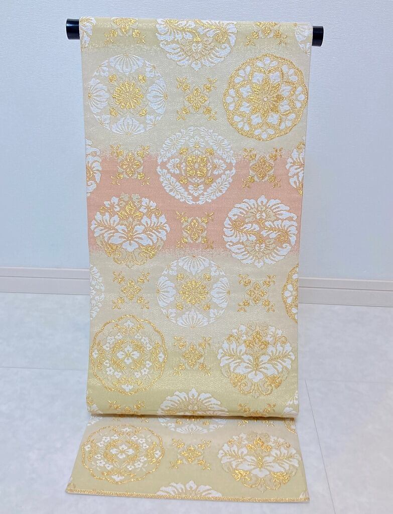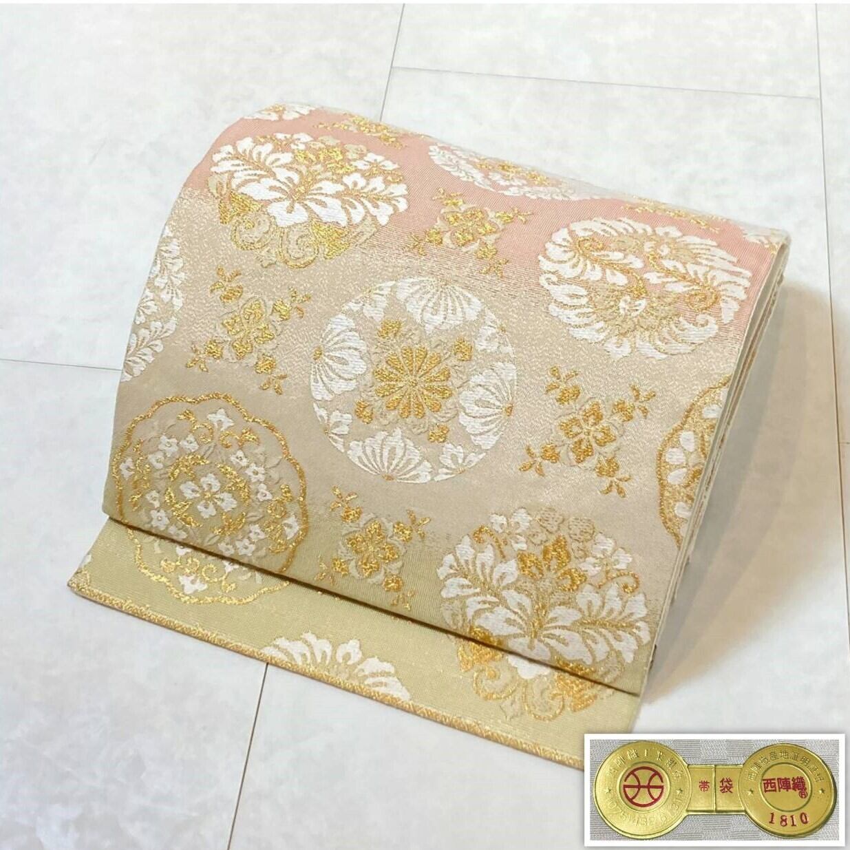 西陣織 金通し 浅田叡一織物 唐織り 金糸 袋帯 華紋 七宝 クリーム ピンク ゴールド 565