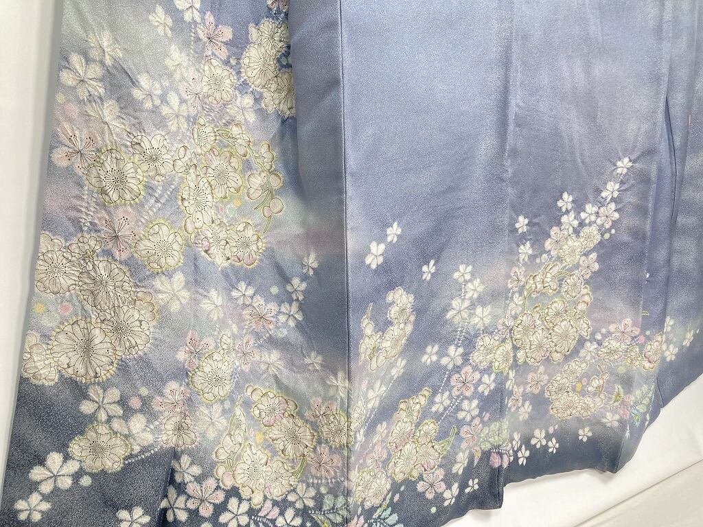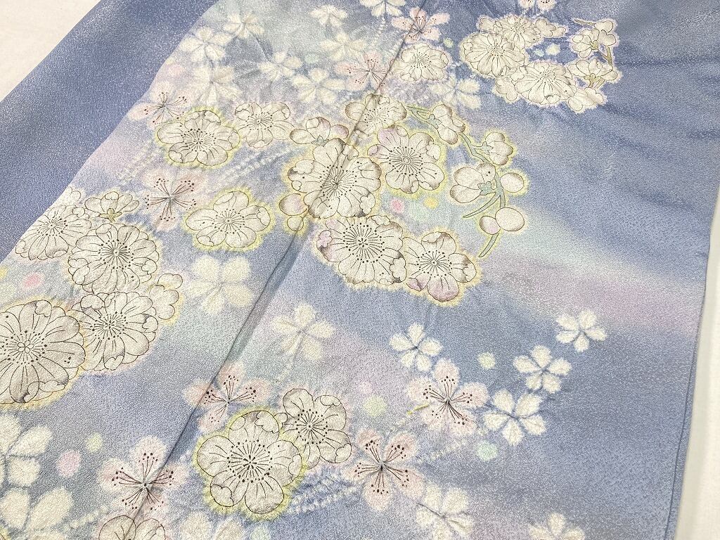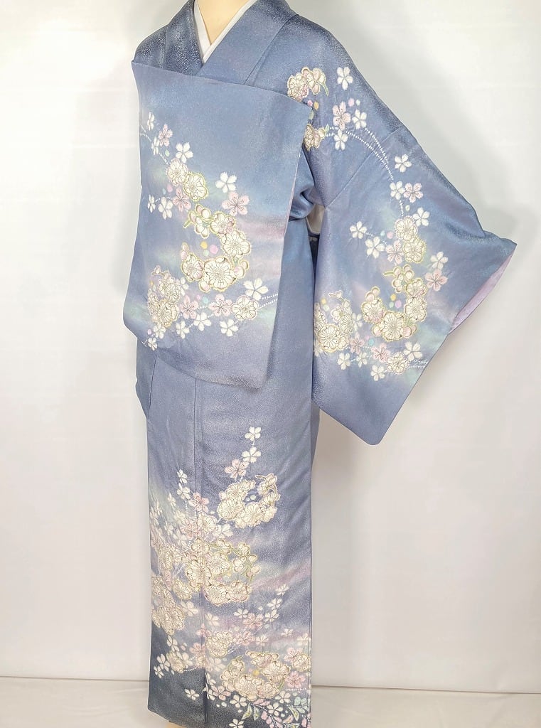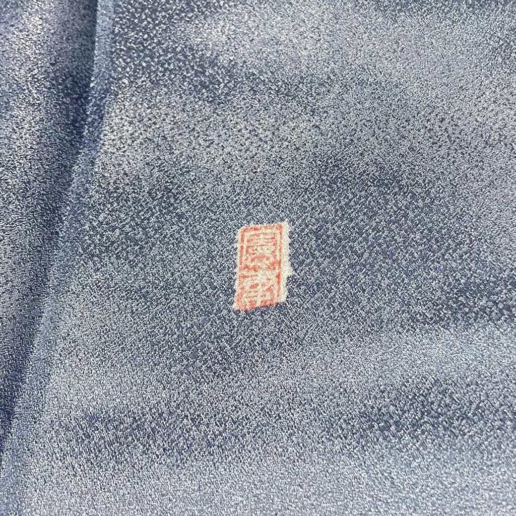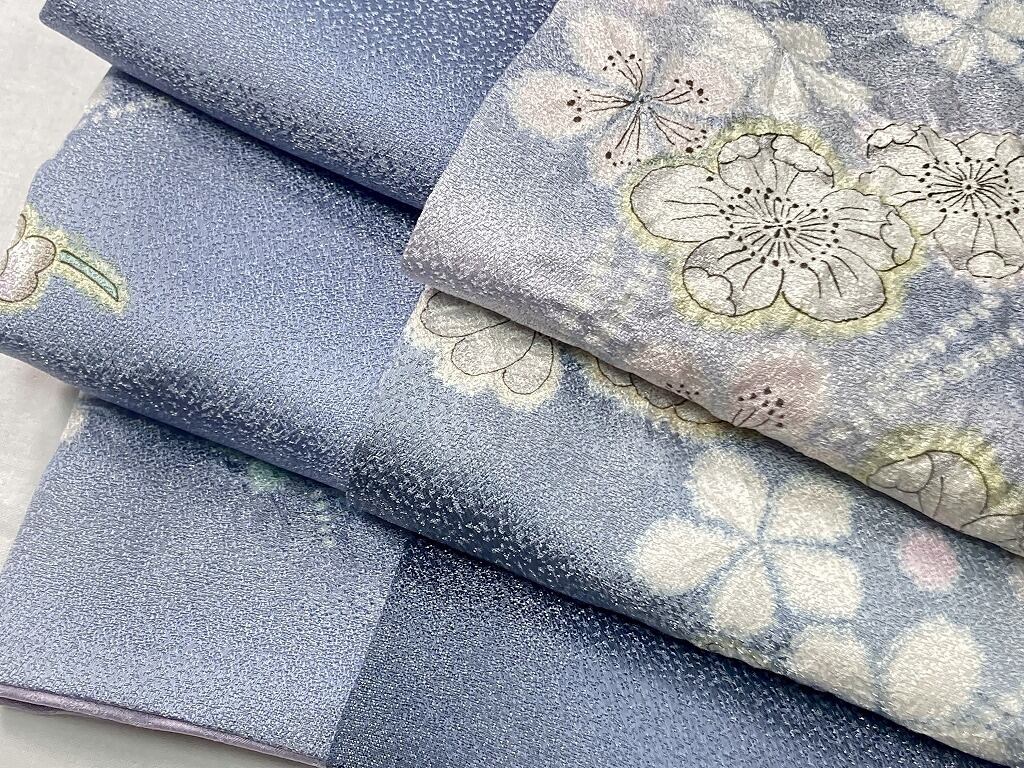 やわらかな「ぼかし染め」の淡い紺色へのグラデーションによりメリハリが生まれ、多彩な「友禅」「絞り染め」「ぼかし染め」「墨絵書き」丹念な「手絞り」を駆使し、清楚な白と紫や優しい紫やティファニーブルー、黄緑などに彩られた[辻ヶ花]が優雅に咲き乱れた、手間隙かけて制作された息を吞むほど美しい作品です。