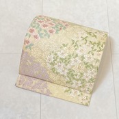 ■優しいクリーム色地に花の[丸紋]を織り出し、刺繍のようにふっくらとした格調高い「唐織り」を駆使し、美しく咲き乱れた花々を優雅に配し、気品高く煌めく「金糸」をさりげなくあしらった、本場西陣で緻密に織り上げた大変加工の良い意匠美の作品です。