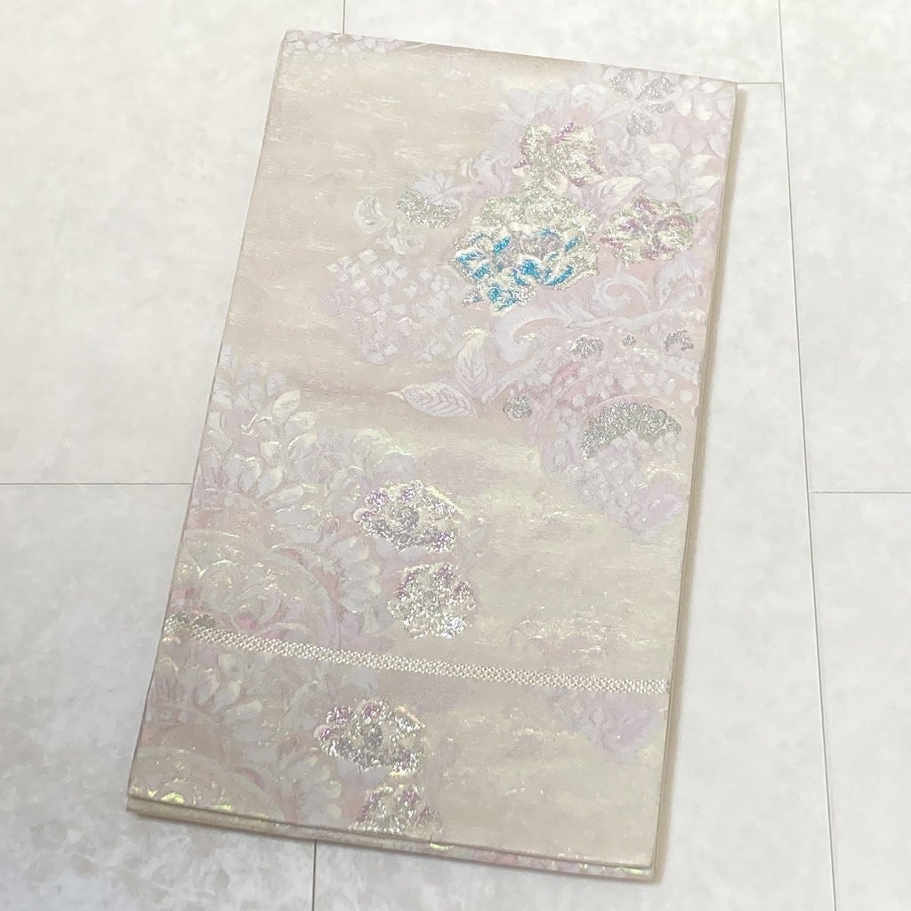 ◇清楚な白地に淡い紫やピンクが美しく、ラメのような煌めきが華やぎを添えた、中世ヨーロッパの雰囲気漂うとても素敵な袋帯です。