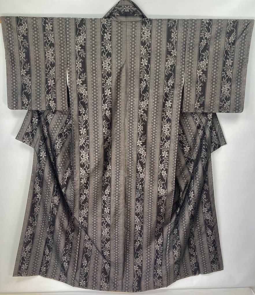 本場大島紬 純泥染め 泥大島 正絹 鉄線 縦縞 小紋 黒 茶 グレー 1124