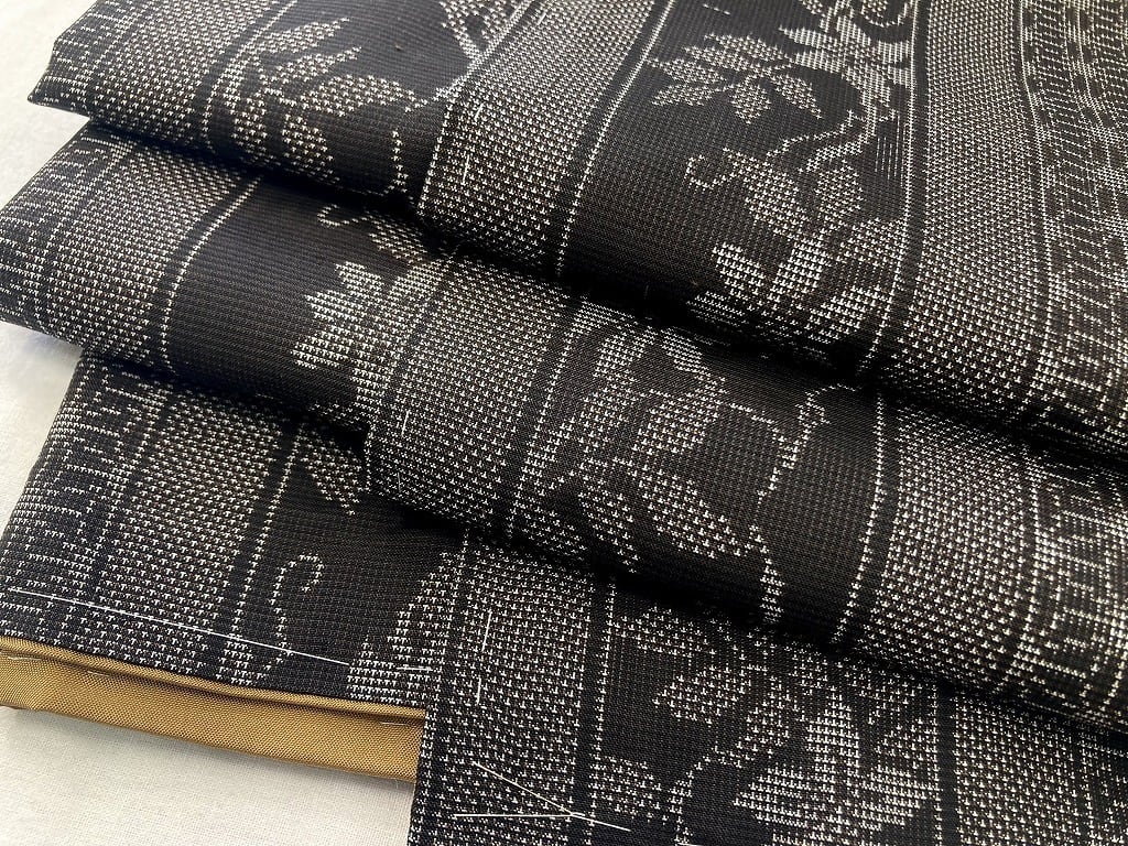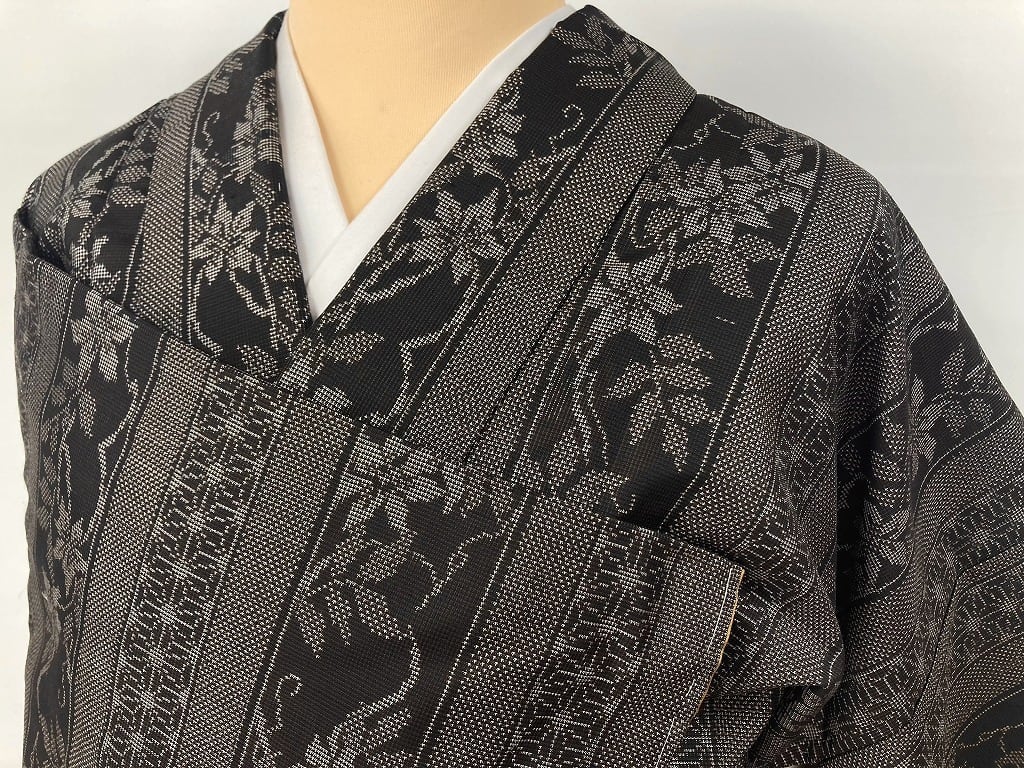 ■化学染料には無い「泥染め」による深くシックな地色に、優雅な[鉄線]とモダンな[麻の葉文様]を縦縞に配し、卓越した職人の「手織り」による巧みな手技で織り出した意匠美の作品です。
