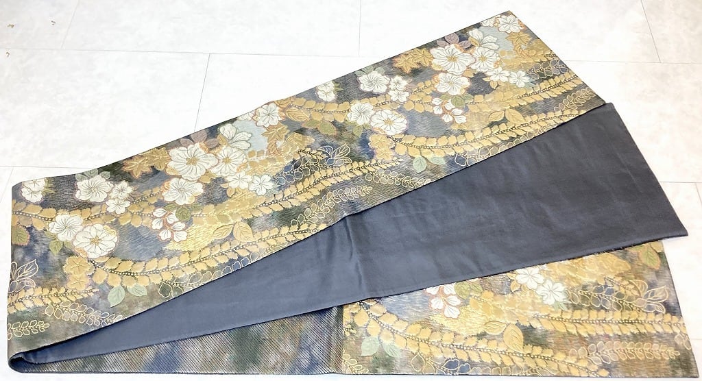 ■黒に近いシックなグレー地に立体的な「纐纈」を配し、七色に煌めく「引き箔」をあしらい、きめ細かな金糸を織り込んだ「金通し」が美しく輝き、気品高く煌めく「金糸」をふんだんに使い、刺繍の様な「唐織り」と立体的な「膨れ織り」を駆使し幻想的な[辻ヶ花]を華麗に織り出しラメが華やぎを添えた、意匠を凝らした素晴らしい作品です。