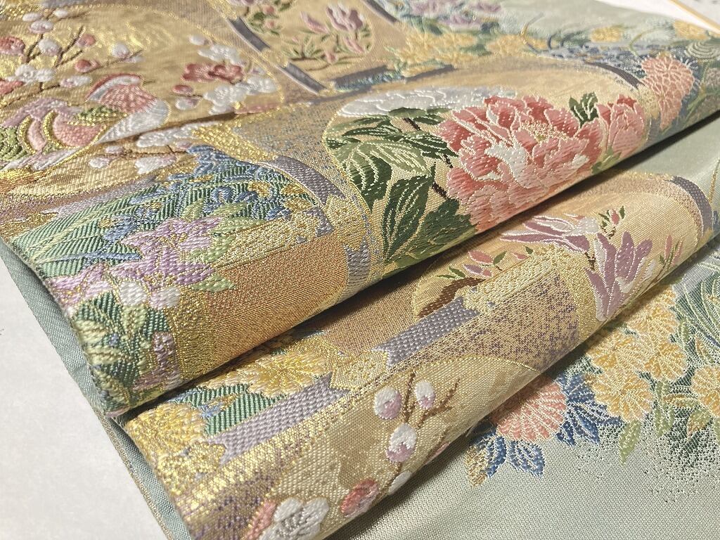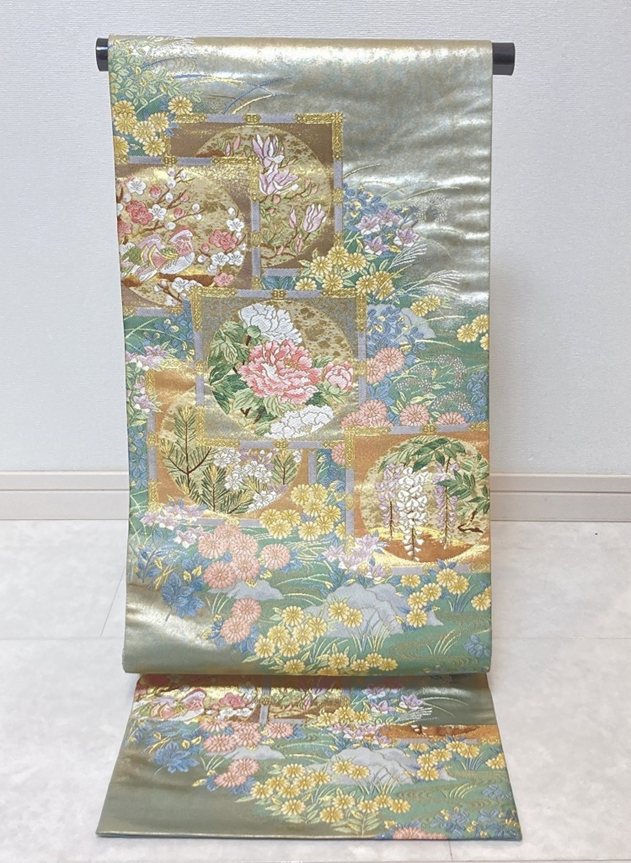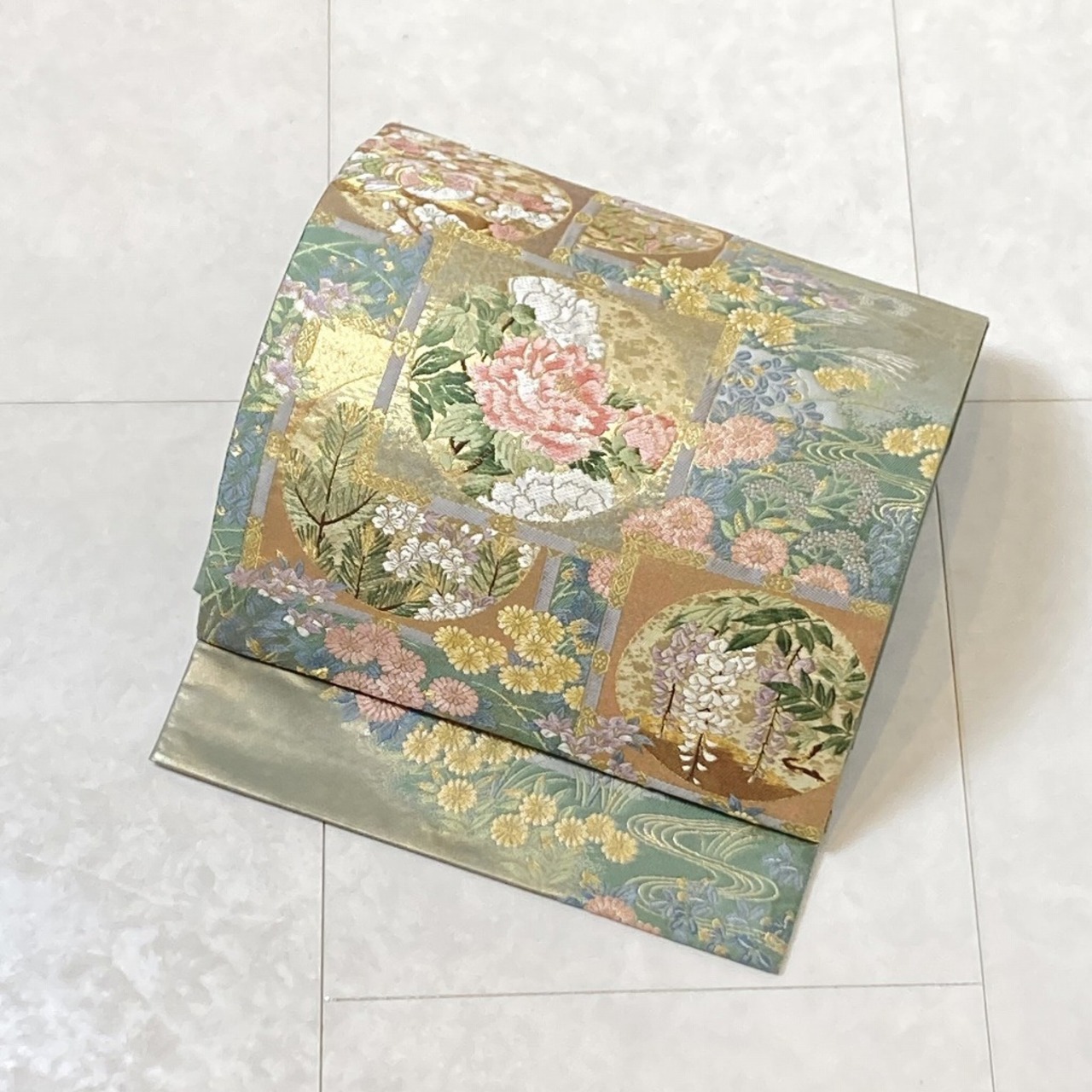 ■淡く爽やかな青緑地に、気品高く煌めく「本金箔」による美しい「引き箔」を施し、格天井のような四角の中に牡丹・梅・桜・藤などの[四季の花々]をあしらった丸紋を配し、菊・桔梗・萩などの花々が咲き乱れた、ふっくらとした刺繍のような緻密な「唐織り」で精巧に織り上げた、うっとりするほど美しい大変加工の良いお品です。