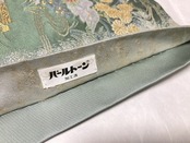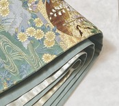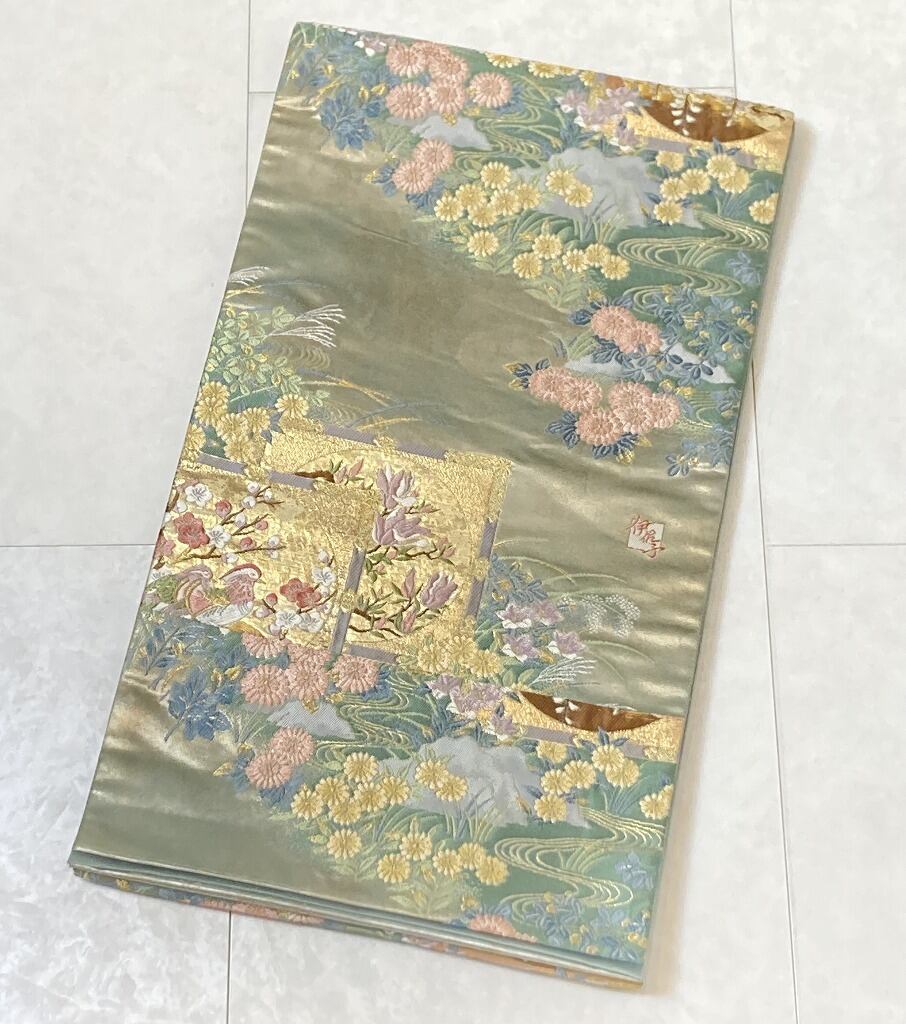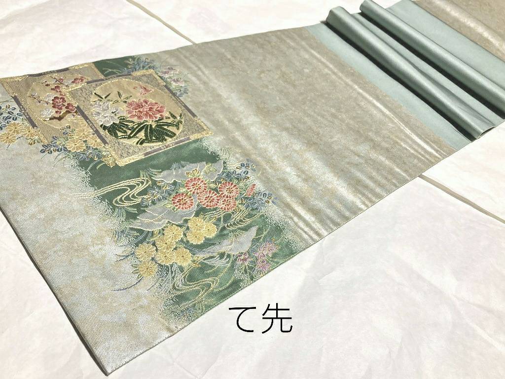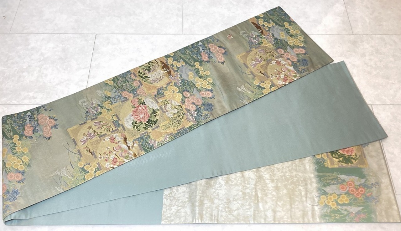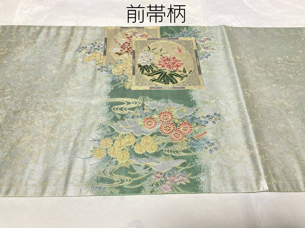 ■淡く爽やかな青緑地に、気品高く煌めく「本金箔」による美しい「引き箔」を施し、格天井のような四角の中に牡丹・梅・桜・藤などの[四季の花々]をあしらった丸紋を配し、菊・桔梗・萩などの花々が咲き乱れた、ふっくらとした刺繍のような緻密な「唐織り」で精巧に織り上げた、うっとりするほど美しい大変加工の良いお品です。