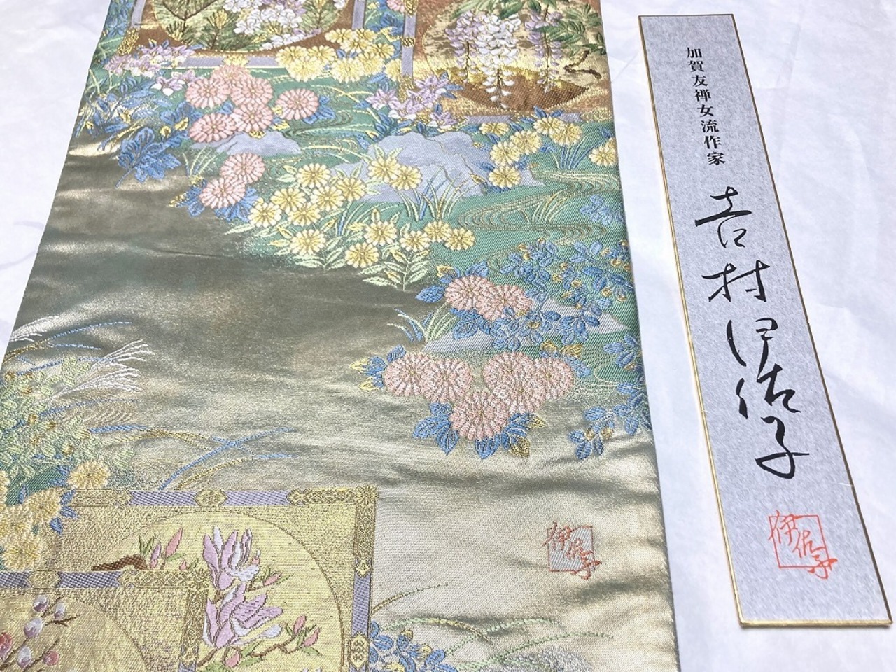 本加賀友禅 吉村伊佐子 唐織り 袋帯 花柄 正絹 緑 赤 白 585