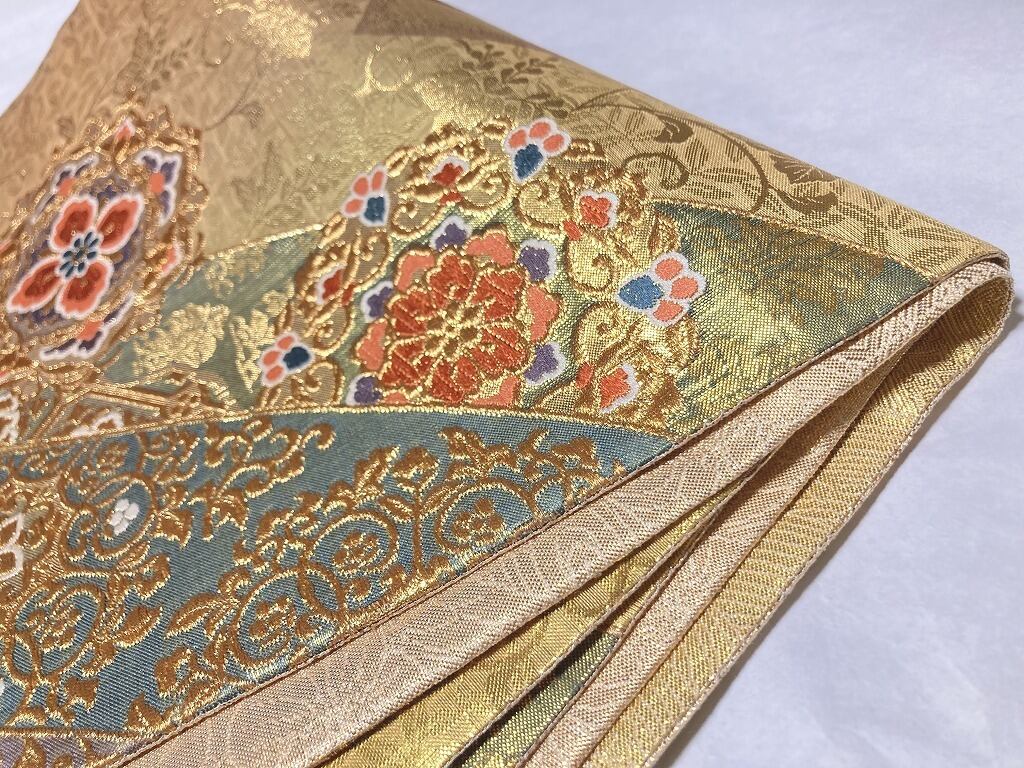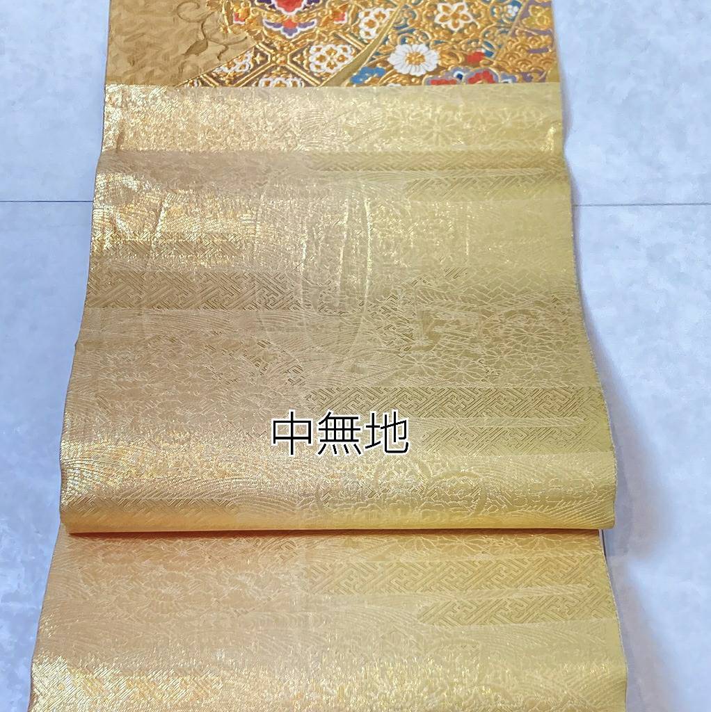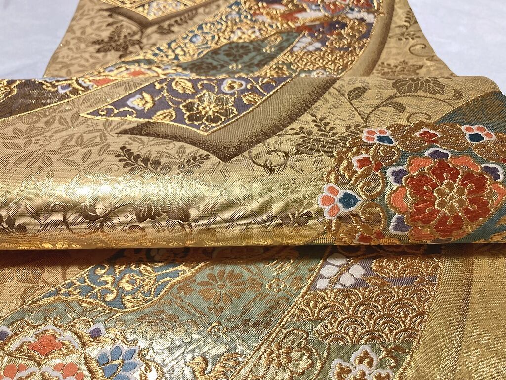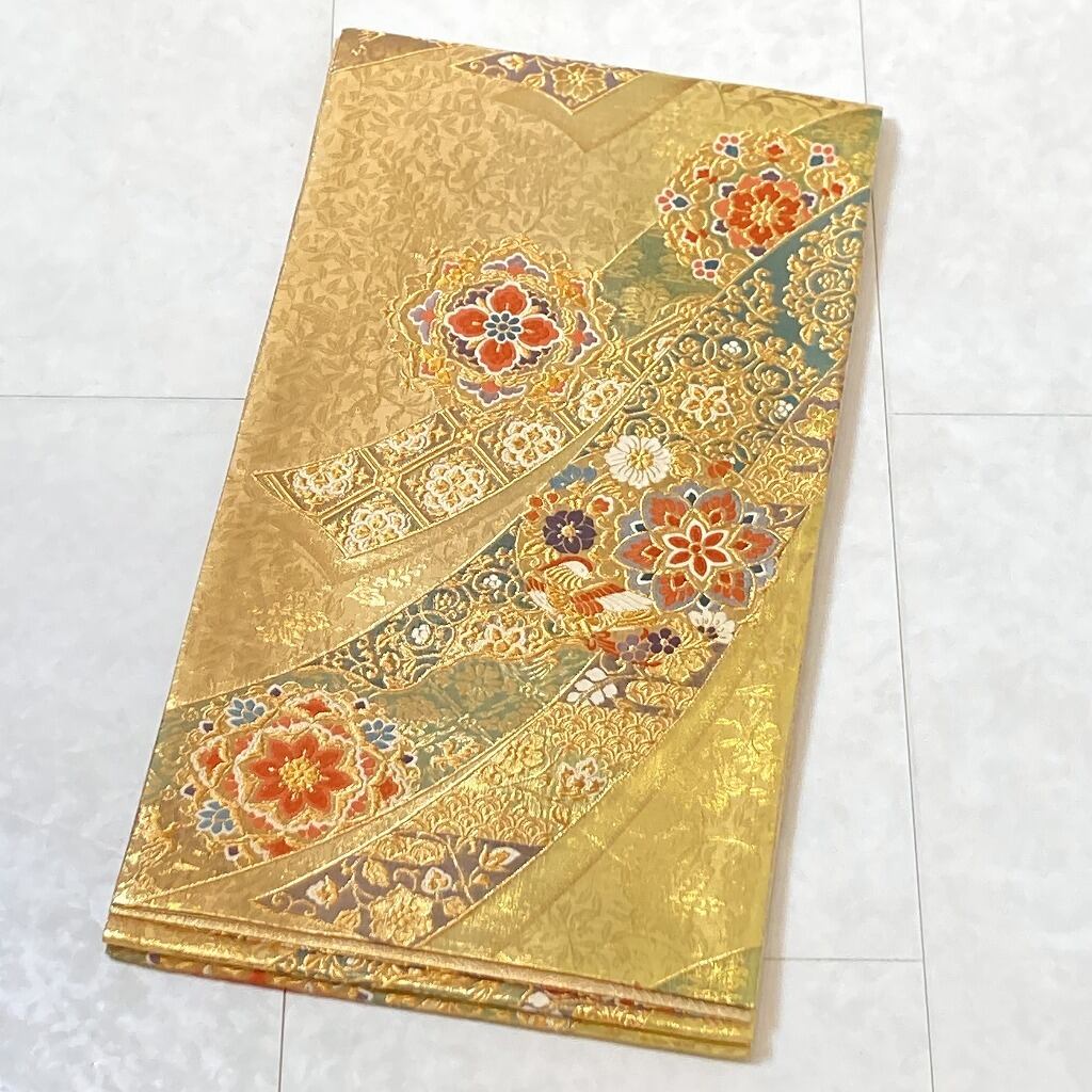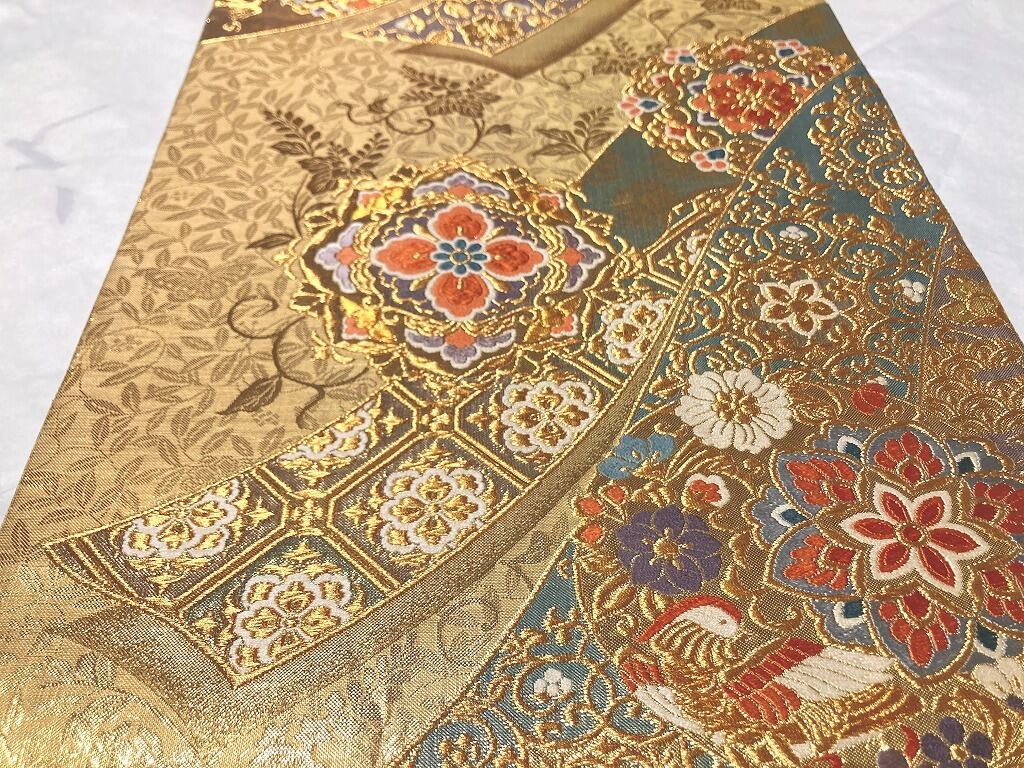 ■黄緑がかったゴールドから赤みがかったゴールドへのグラデーション地に、優美な葉柄に格調高い[桐]を間隔良く配した繊細な「地紋」を丹念に織り出し、美しく煌めく「金糸」をふんだんに使い、刺繍のようなふっくらとした「唐織り」で、優雅な[華紋]や花々に鳳凰をあしらった[丸紋]を配し、オリエンタルな[唐花]や[宝相華]を描いた雅やかな[熨斗]を流れるように大胆に織り出した、意匠美の素晴らしい作品です。