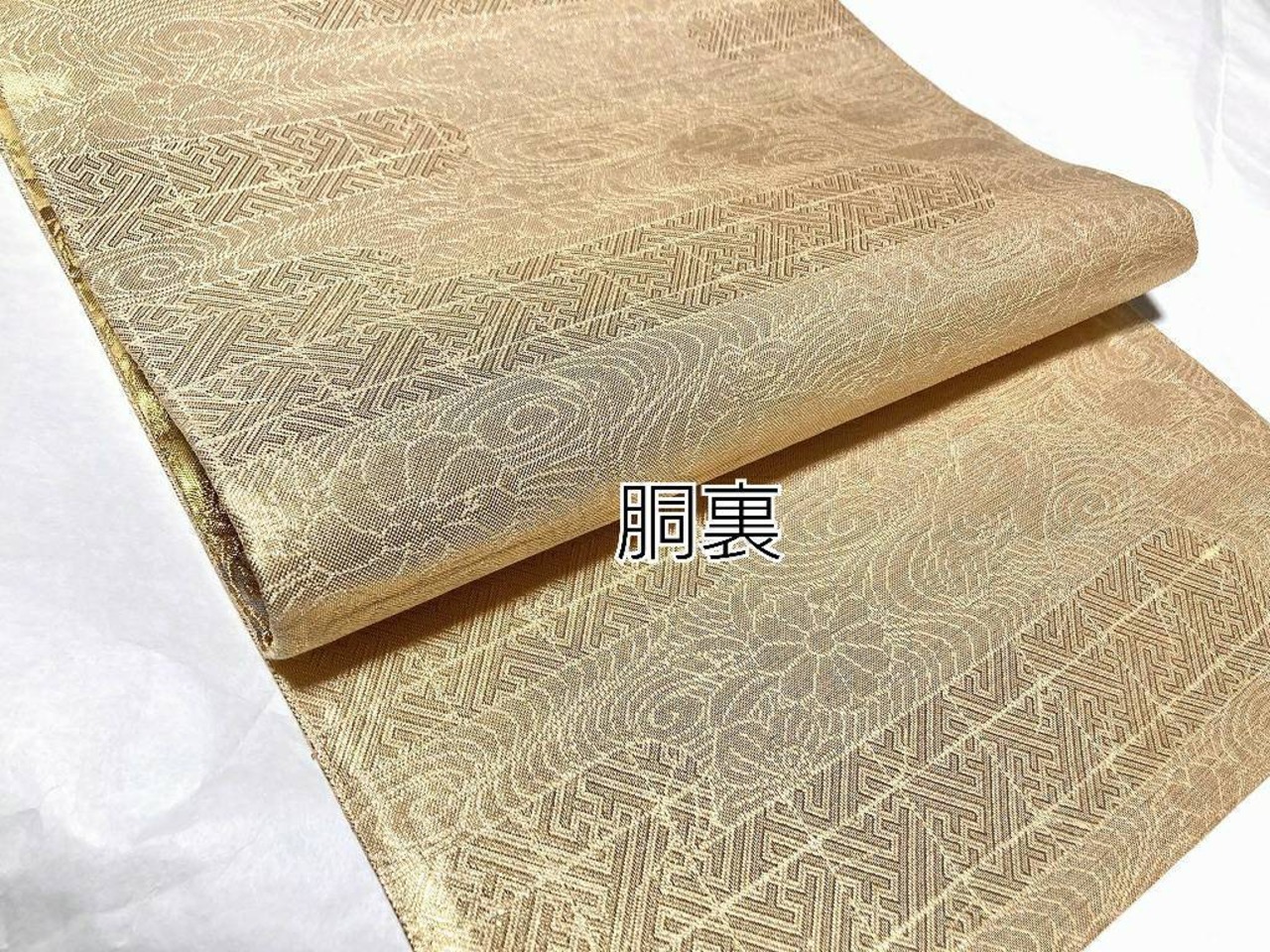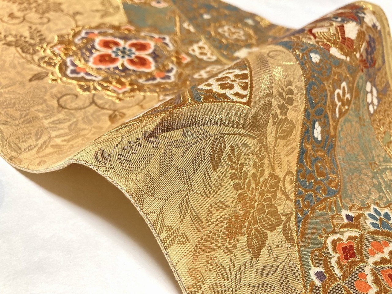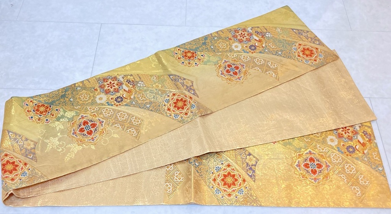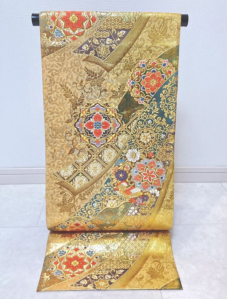 ■黄緑がかったゴールドから赤みがかったゴールドへのグラデーション地に、優美な葉柄に格調高い[桐]を間隔良く配した繊細な「地紋」を丹念に織り出し、美しく煌めく「金糸」をふんだんに使い、刺繍のようなふっくらとした「唐織り」で、優雅な[華紋]や花々に鳳凰をあしらった[丸紋]を配し、オリエンタルな[唐花]や[宝相華]を描いた雅やかな[熨斗]を流れるように大胆に織り出した、意匠美の素晴らしい作品です。