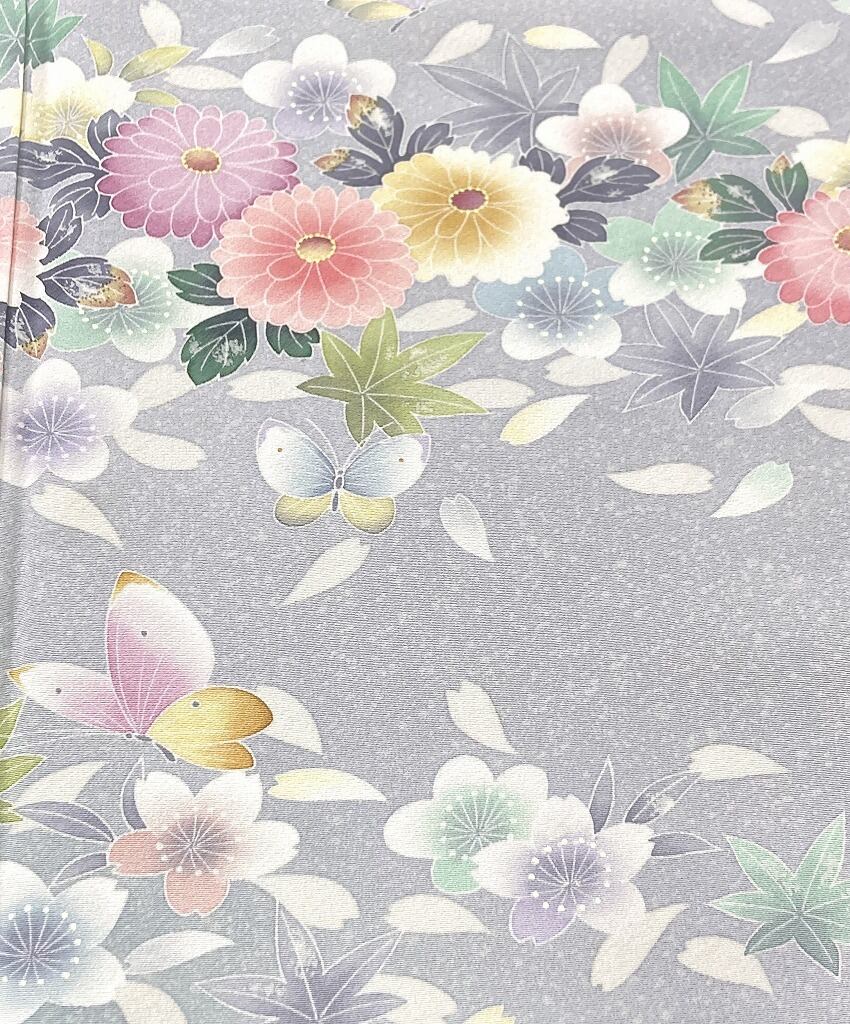 やわらかな「ぼかし染め」で優しい青緑への美しいグラデーションを配し、繊細な手描きを添えた「型染め友禅」で、鮮やかに彩られた菊・桜・梅などの[四季の花々]に花びらを散りばめ[蝶]が優雅に舞い、葉の虫食いまで忠実に描いた、うっとりするほど美しい見事な作品です。
