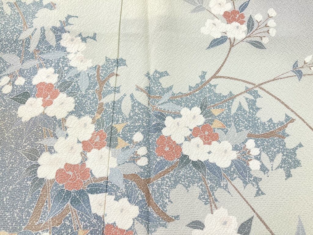 型染め友禅 本金箔 訪問着 袷 正絹 椿 グレー 水色 1169