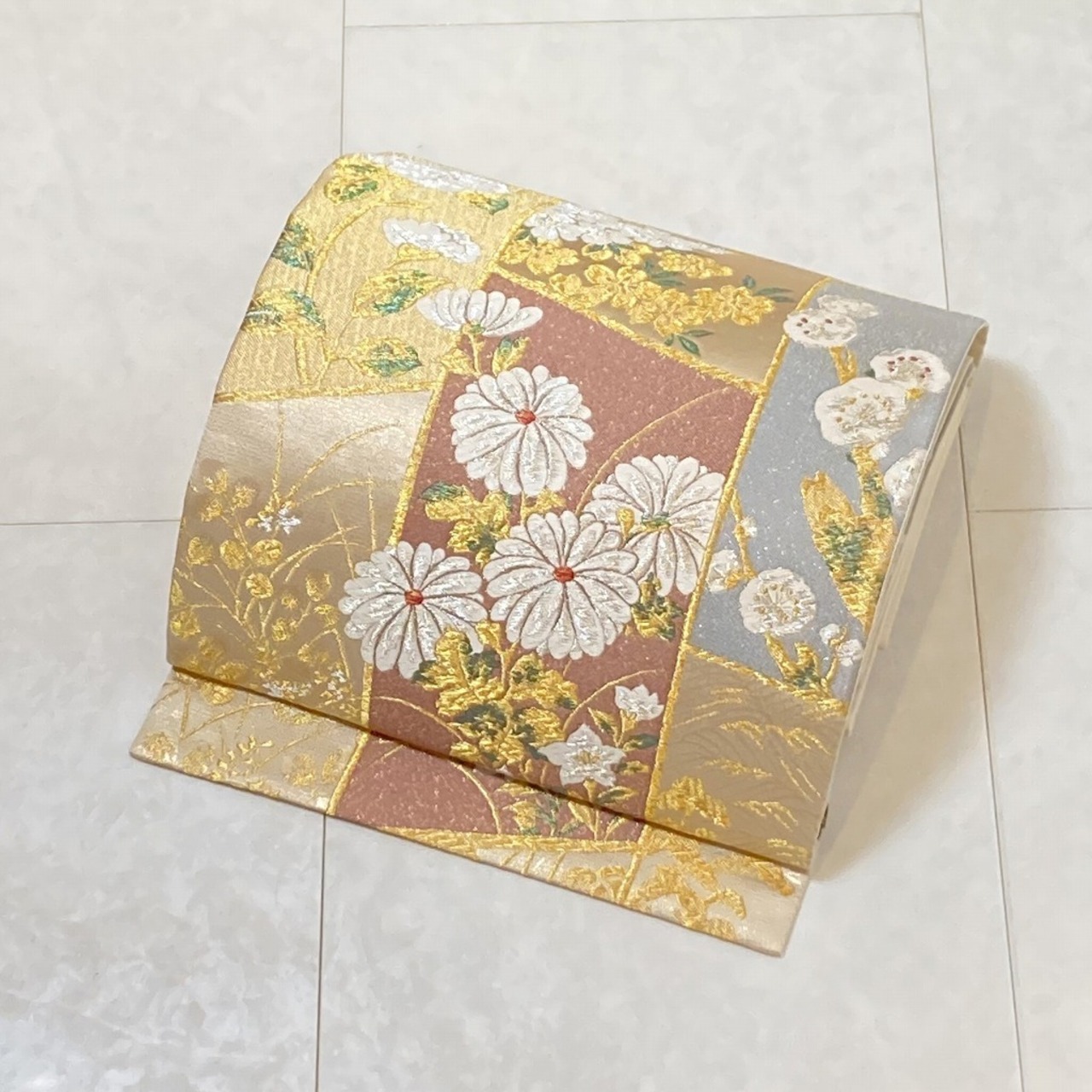 ■美しく輝く「金糸」をふんだんに使い、ふっくらとした刺繍のような格調高い「唐織り」で、菊・椿・梅・桜・桔梗などの[四季の花々]をスタイリッシュに配した、意匠美の作品です。