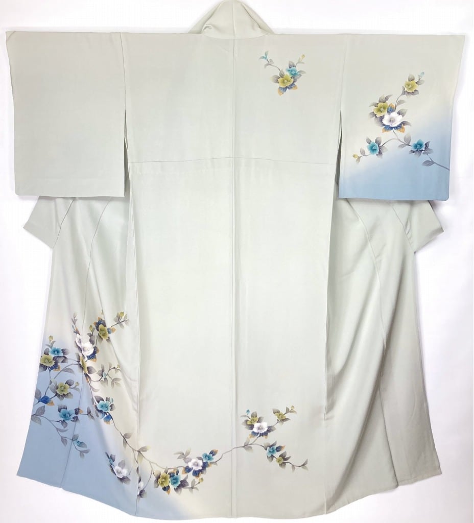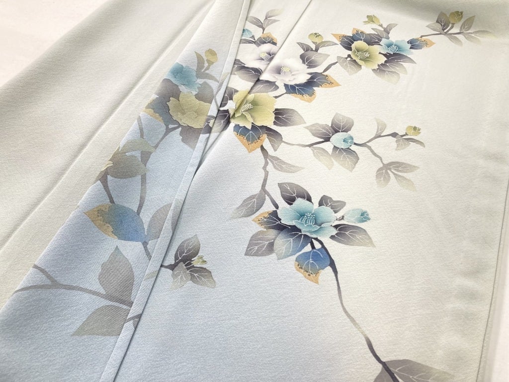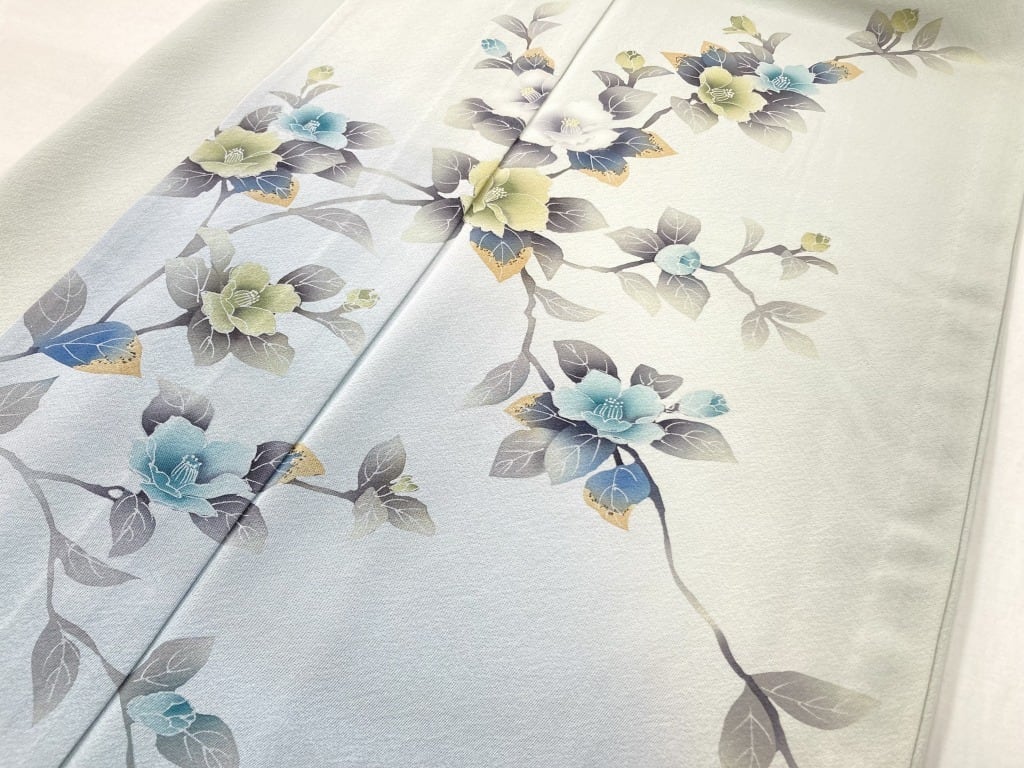 やわらかな「ぼかし染め」で淡い水色への美しいグラデーションが華やぎを添え、葉の虫食いまで忠実に描いた写実的な[椿]を優雅にあしらい、一筆一筆繊細な「手描き友禅」で丹念に描き上げた「本染め」のうっとりするほど美しい作品です。