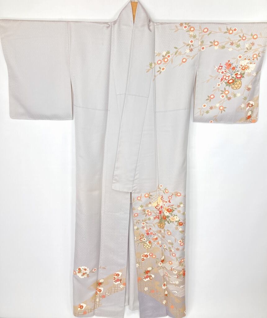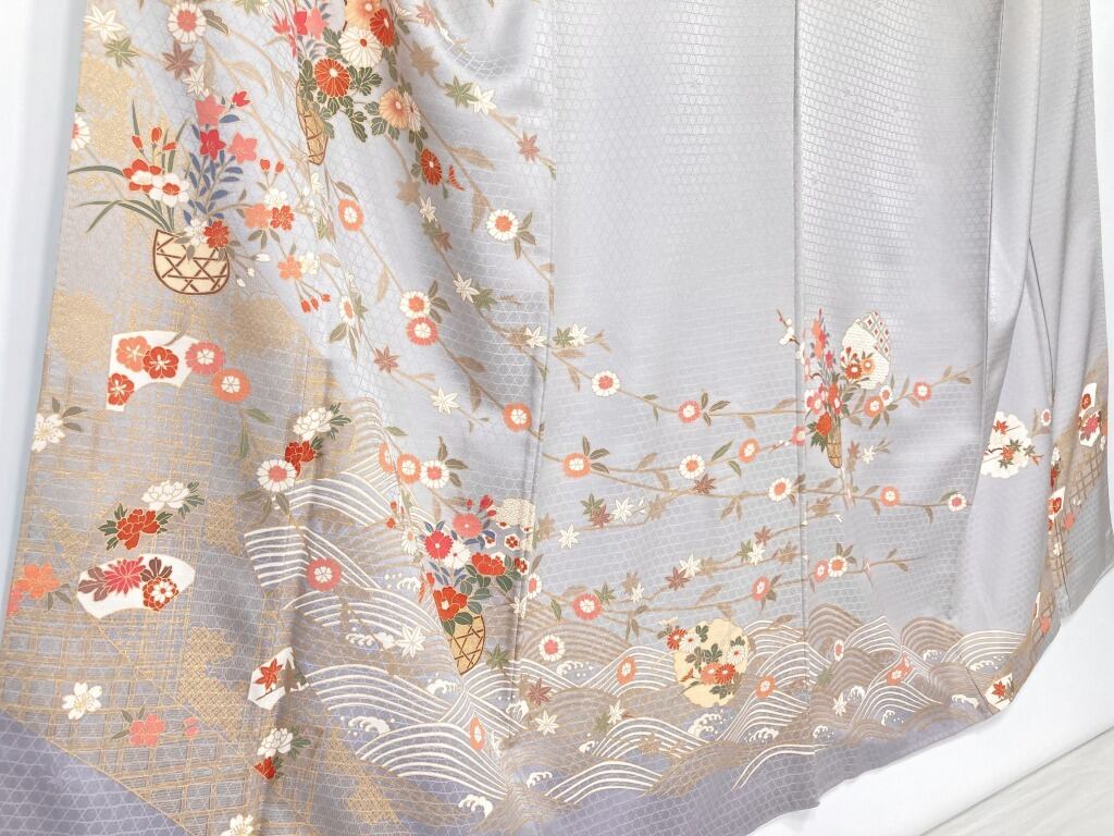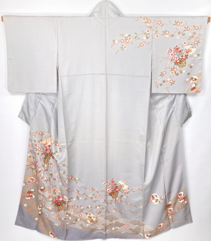 やわらかな「ぼかし染め」による美しいグラーデーションによりメリハリが生まれ、雅やかな[熨斗]とモダンな[波文]をあしらい、菊・梅・椿・牡丹などの[四季の花々]が咲き乱れ、[花籠][扇面][雪輪]を間隔良く配した、精巧な「型友禅」や気品高く煌めく緻密な「金彩」をふんだんにあしらった意匠美の作品です。