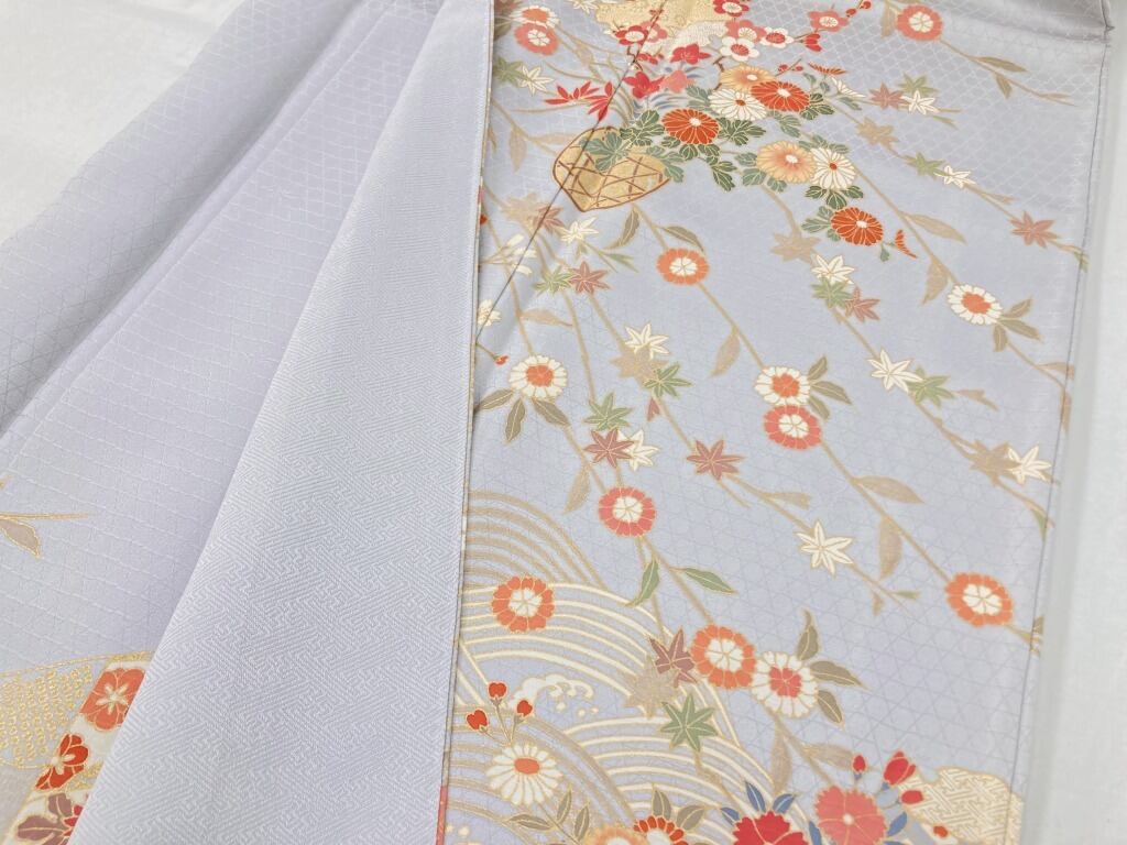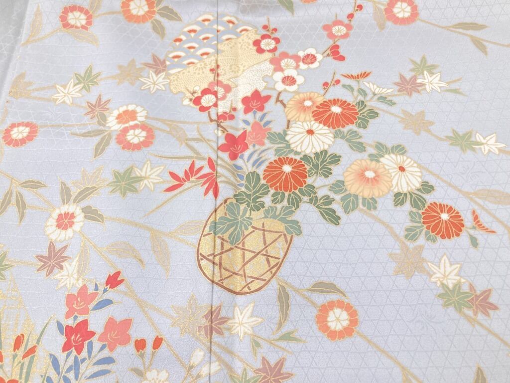 未使用 京友禅 金彩 四季の花々 訪問着 袷 正絹 水色 グレー 白 紫 1189