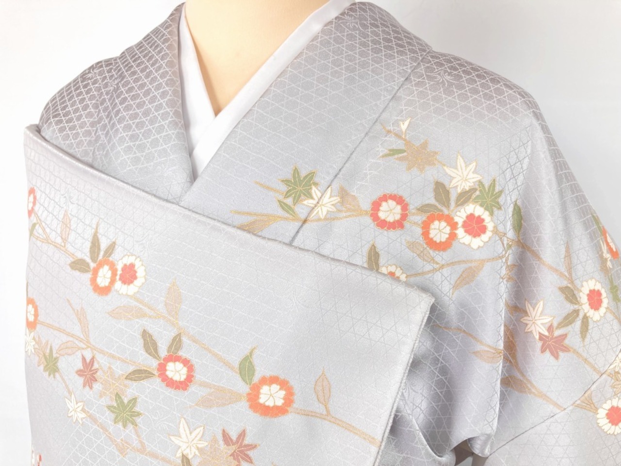 ほんのりと紫ががった白に近い明るいグレーの様で、角度により淡い水色や紫にも見える、爽やかでとても美しい地色です。