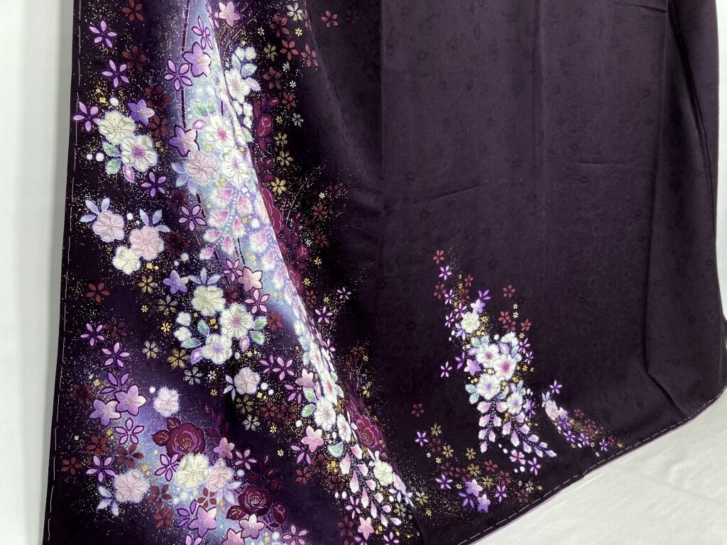 多彩な「友禅」「ぼかし染め」「墨絵書き」「手絞り」を駆使し、ピンクや紫などの淡く優しい色合いで彩られた[辻ヶ花]が優雅に枝垂れ、深い紫の艶やかな[薔薇]を配し、気品高く煌めく「金彩」「銀彩」を散りばめた、意匠を凝らした素晴らしい作品です。