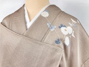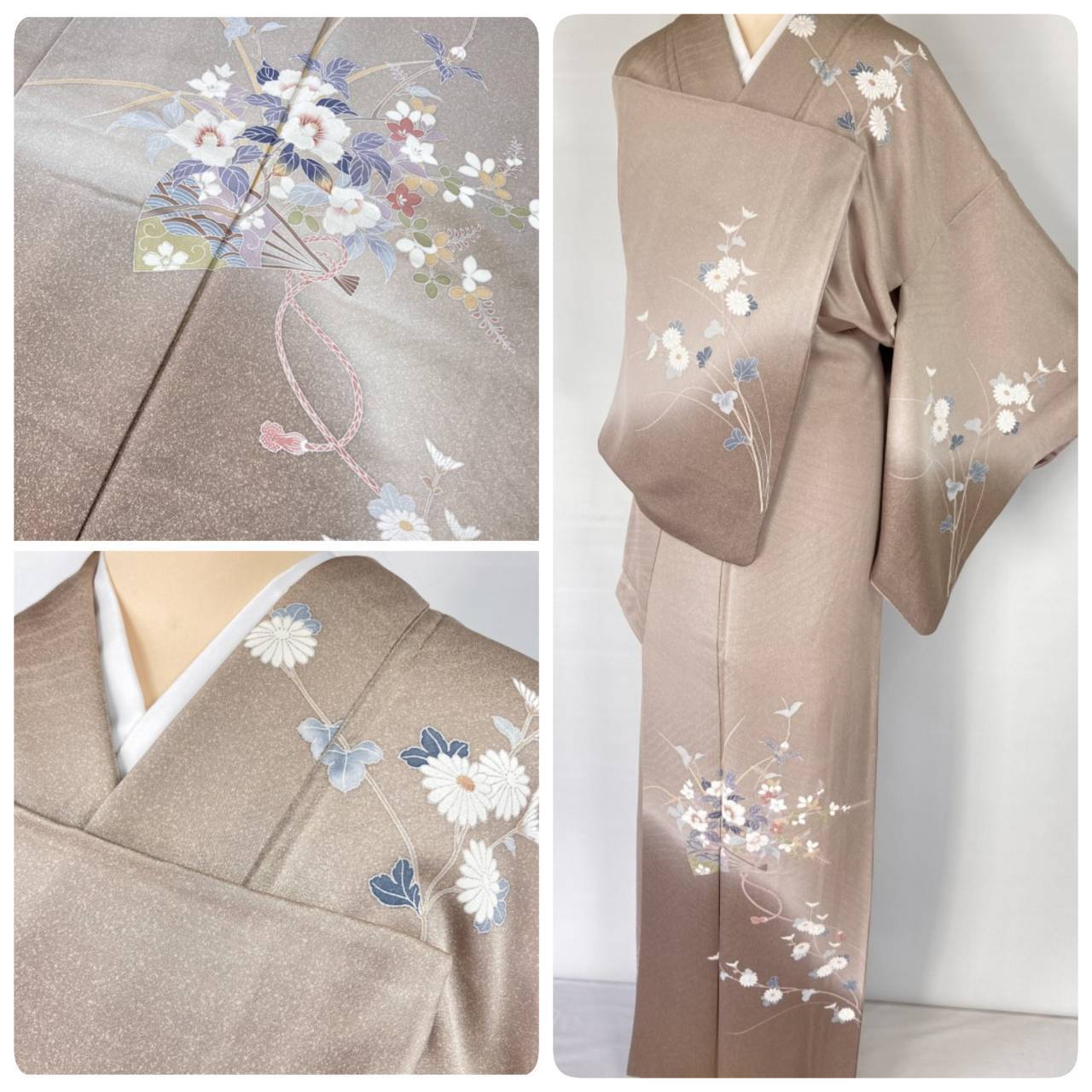 繊細な「天目染め」を全体にあしらい独特のきめ細かな模様により奥行きが生まれてやわらかな色合いになり、やわらかな「ぼかし染め」でシックな茶色へのグラーデーションによりメリハリが生まれ、繊細な「型染め友禅」で椿・桔梗・菊などの花々に[扇面]を配した洗練されたデザインです。