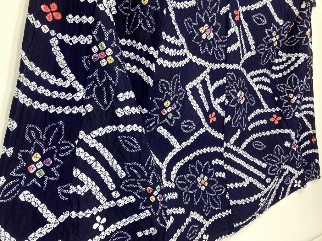 ■ほのかに赤みを含んだ濃紺のネイビー地に、「手蜘蛛絞り」「小帽子絞り」「人目絞り」を駆使し、モダンな[鉄線]に大柄な[流水]を配し、赤や白のかわいい[花びら]を間隔良く散りばめ、丹精込めた手仕事による素晴らしい作品です。