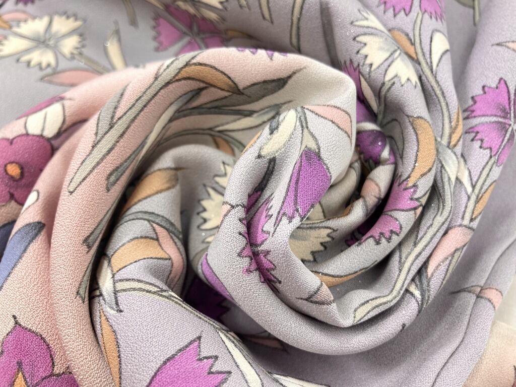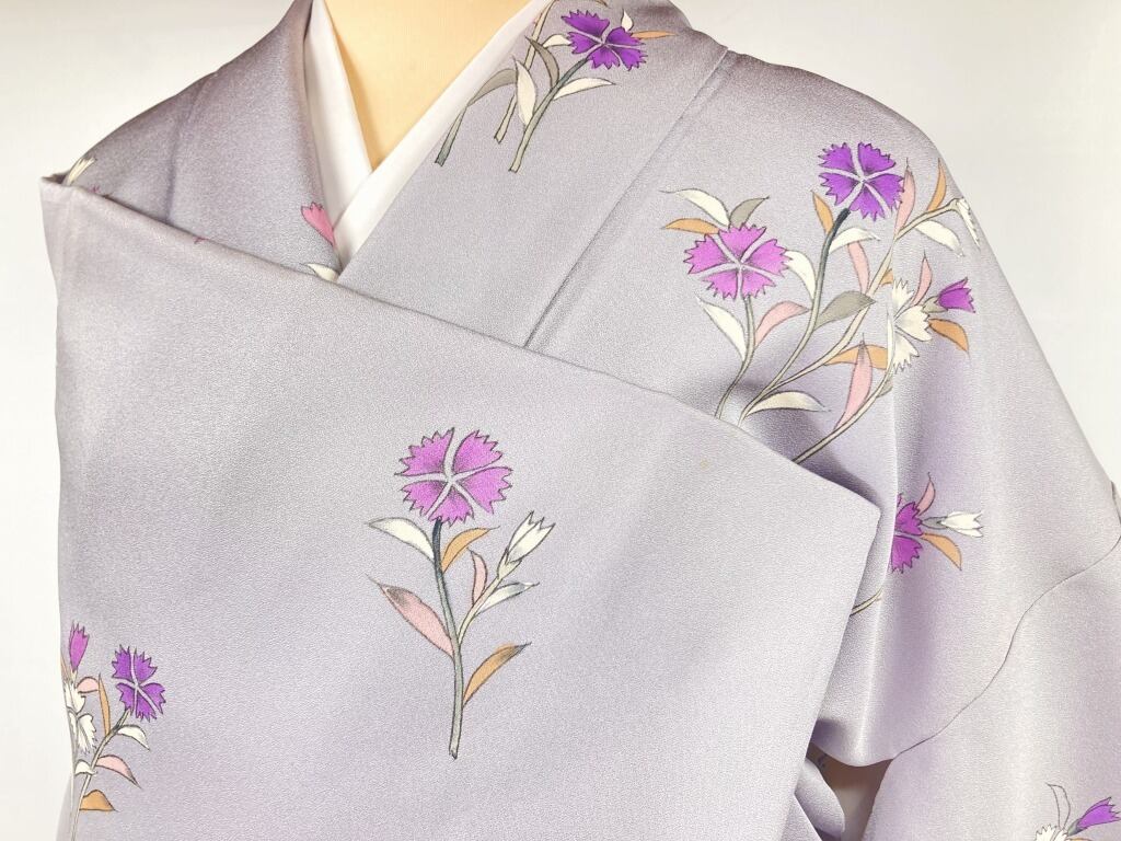 やわらかな「ぼかし染め」でピンク色がかった淡い赤紫への「染め分け」により華やぎが生まれ、優雅な[唐花]にかわいい[撫子]が華麗に咲き乱れ、きめ細かく散りばめた「銀箔」が美しく輝いた、一筆一筆息遣いの聞こえる「手描き友禅」で丹念に描き上げた、見事な絵羽柄の素晴らしい作品です。