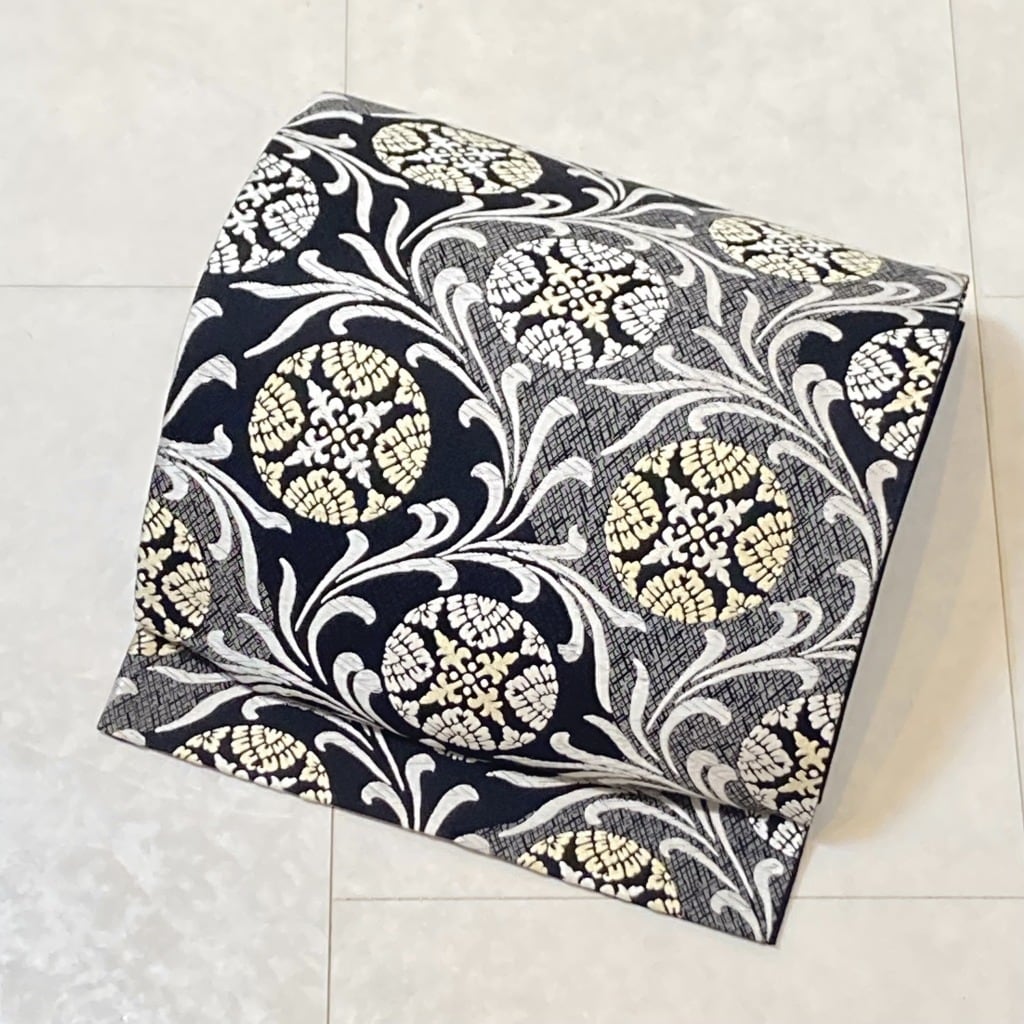 唐織り 宝相唐草 袋帯 正絹 黒 白 グレー クリーム 645