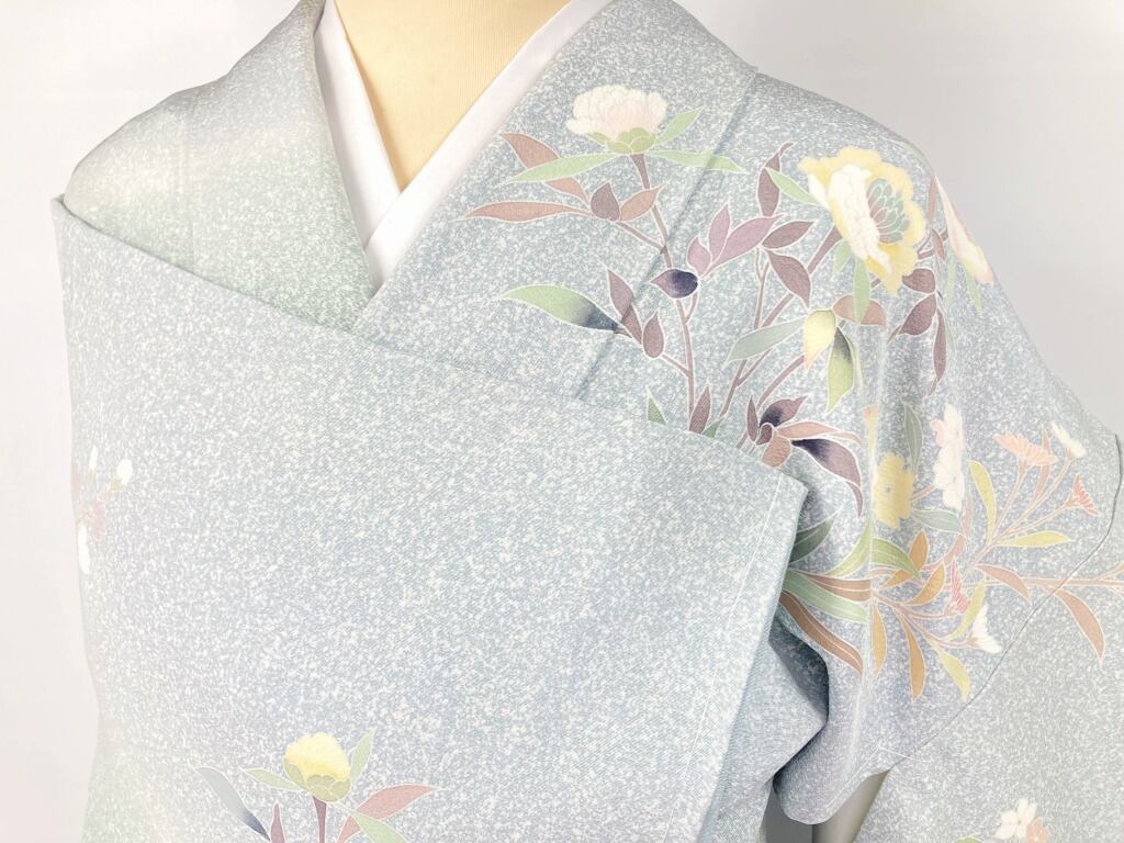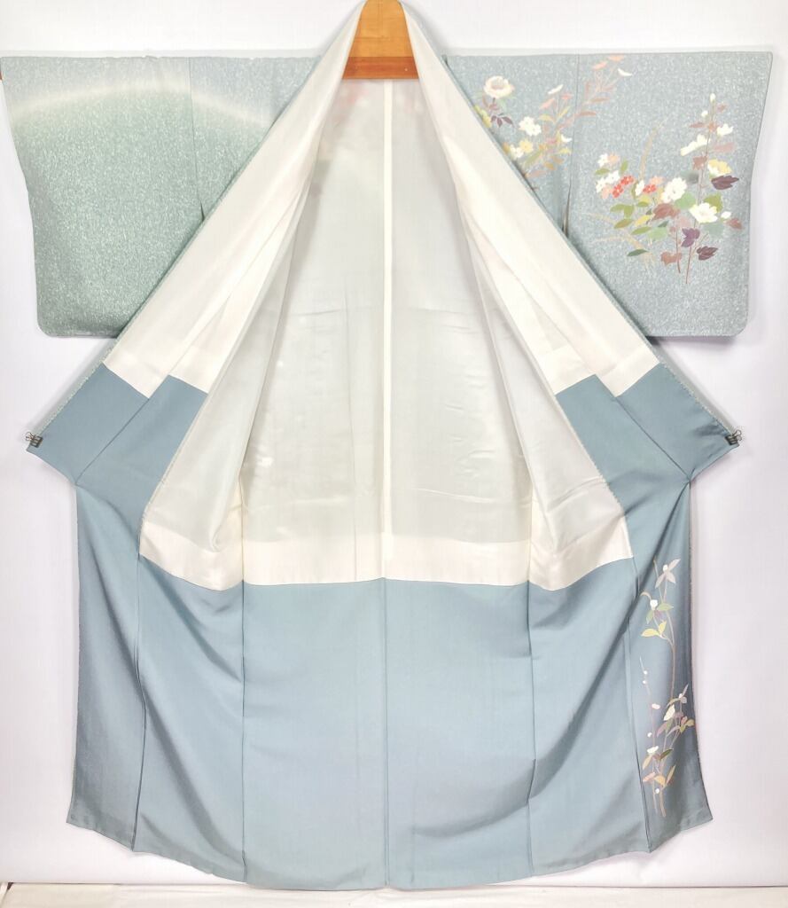 熟練の技を必要とする繊細な「蒔き糊散らし」を全体に施し、明るく爽やかな色合いになり奥行きや立体感が生まれ、やわらかな「ぼかし染め」により淡く優しい水色・黄緑・紫などの華麗な「染め分け」を配し、緻密な「型染め友禅」で、色とりどりに彩られた牡丹・椿・菊・杜若などの[四季の花々]が咲き乱れた大変美しい作品です。